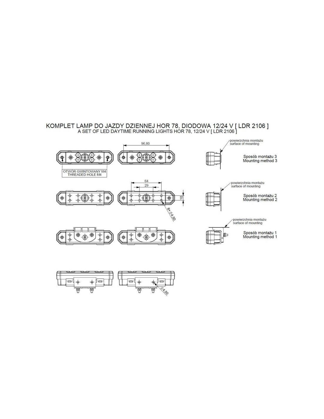 Pack 2 Unidades de Luz diurnas LED Homologadas con 3 tipos de instalación, validas para 12V y 24V y incluye Piloto LED con 6w de consumo cada uno con cable de 3X0,5mm2 y 2,5 metros de longitud para su instalación.
