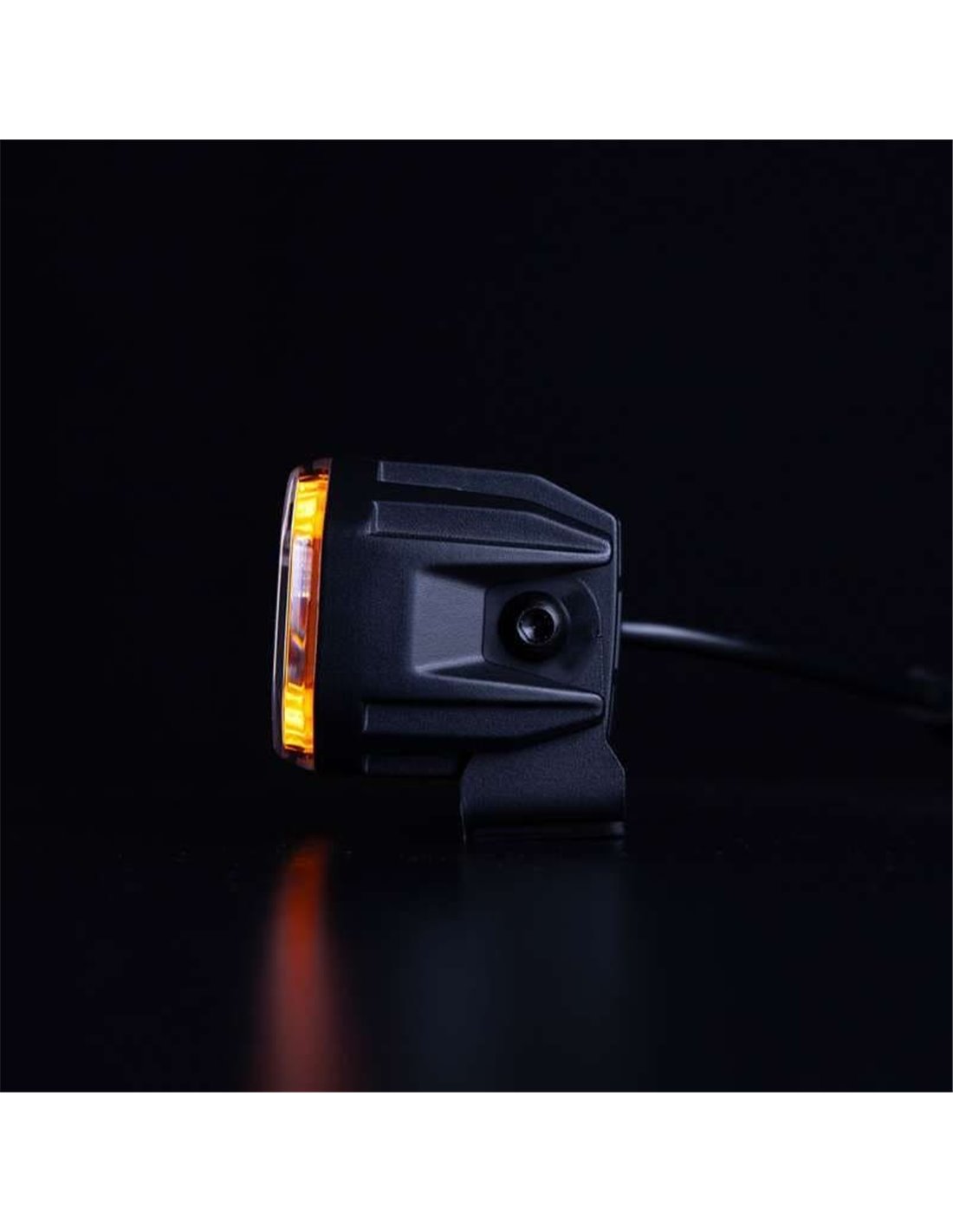 Su diseño compacto y robusto permite una instalación versátil en diferentes tipos de vehículos y maquinaria. El soporte ajustable de 180° facilita la orientación del haz de luz según las necesidades del trabajo. Las luces de posición en ámbar y rojo añaden visibilidad y seguridad adicional.