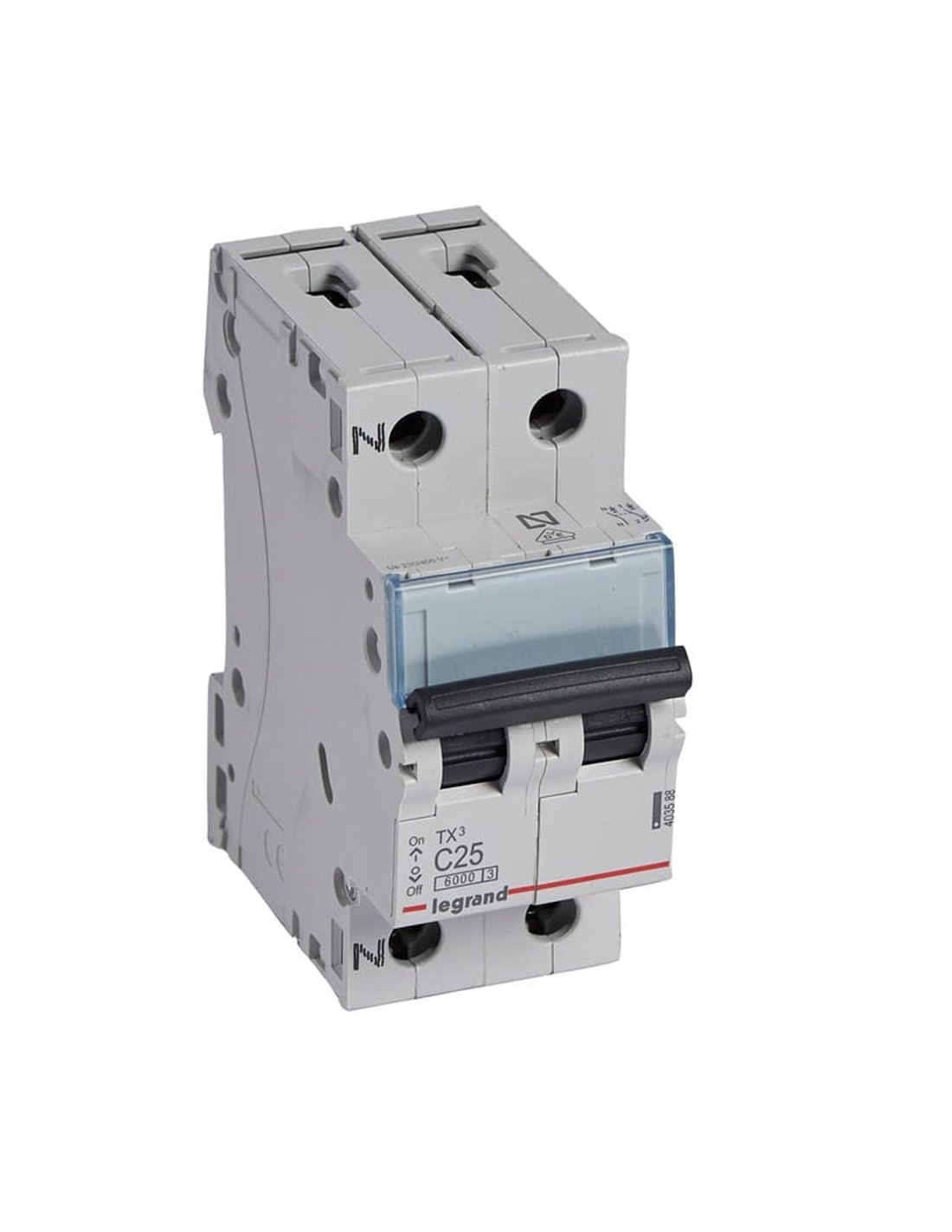 El magnetotérmico Legrand TX³ 403588 protege un circuito monofásico frente a sobrecargas y cortocircuitos. Formato 1P+N de 25 A, curva C y 6 kA de poder de corte, pensado para tomas dedicadas, horno, AA y líneas con picos moderados a 230 V~. Ocupa 2 módulos, se monta en carril DIN y admite barra colectora y cable mediante terminal enroscado. Al ser 1P+N, corta fase y abre el neutro, mejorando la seguridad y facilitando el mantenimiento del cuadro.