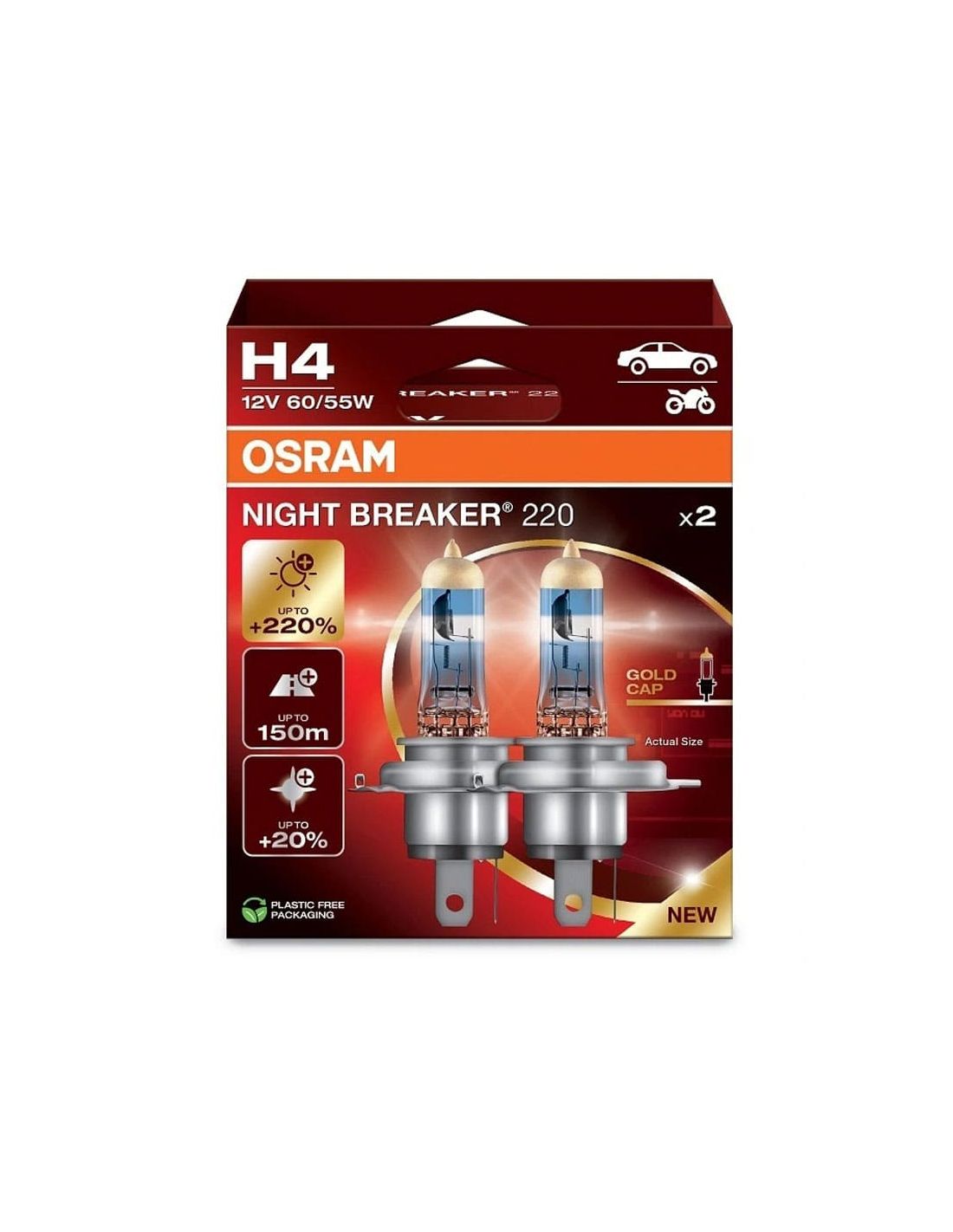 Pack de 2 Bombillas Halógenas H4 Osram Night Breaker 220 (P43t-38) para Vehículos de 12V con una potencia de 55W y un 200% + de Luz que una Bombilla Convencional y un 20% de luz mas blanca, así es la nueva generación de Osram Night Breaker 220, el alcance de haz de luz es de 150 metros.