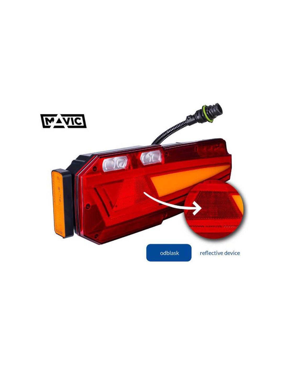 Piloto LED multifunción trasero modelo Mavic con 6 funciones, válido para instalar en 12v y en 24V, para su instalación esta disponible con 1,5 metros de cable o con 0,3 metros de cable con conector 7 Pin. Este Piloto multifunción es perfecto para instalar en Plataformas o Remolques, está totalmente homologado y es sumergible.