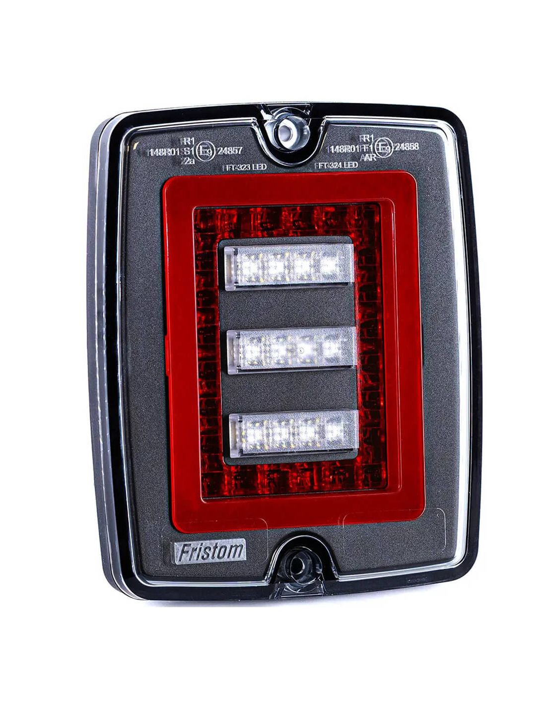 Piloto trasero LED FT-324 con marco de montaje rectangular. 3 funciones: posición NEON, luz de marcha atrás y antiniebla. Compatible 12V-30V, instalación en superficie y homologación E9.