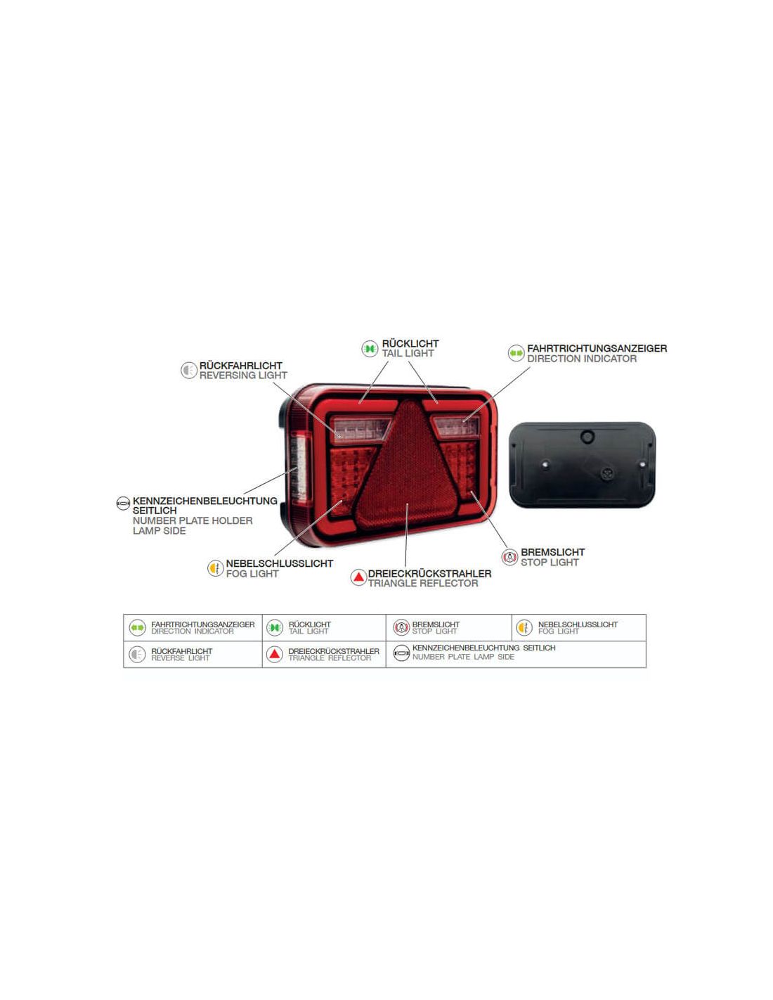 Funciones: Posición, Freno, Intermitente, Niebla, Marcha Atrás, Triangulo Reflectante y Luz de Matrícula Lateral.