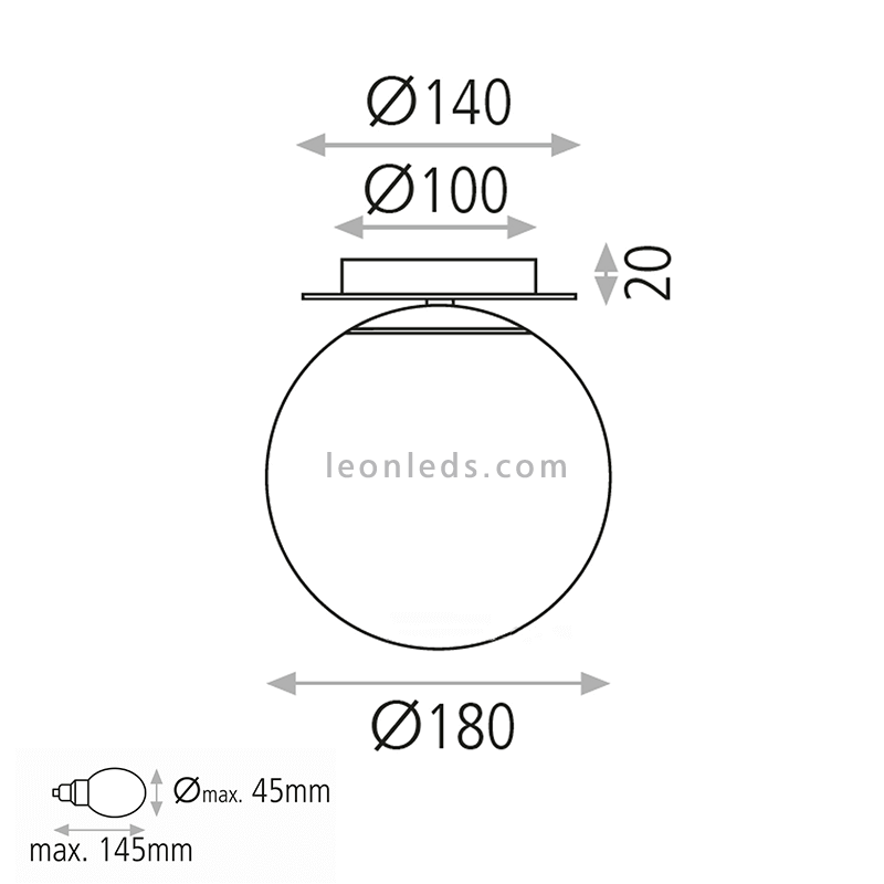 Incluye un casquillo para alojar una bombilla LED E27 de 15W como máximo, suficiente para iluminar agradablemente con un diámetro máximo de Ø45mm. Tiene una protección IP44 que lo hace impermeable y adecuado para su instalación en baños o zonas húmedas.