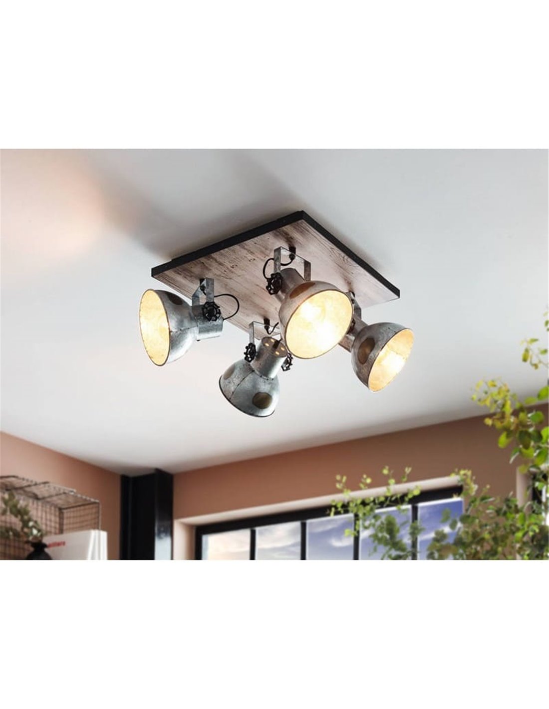 El plafón cuadrado de techo BARNSTAPLE de la reconocida marca EGLO es la opción ideal para quienes buscan un diseño industrial y rústico en su hogar. Está formado por un cuerpo de metal cuadrado en acabado negro, acompañado de un elemento decorativo de madera marrón que le aporta un toque cálido y acogedor. Los 4 cabezales móviles de metal con un elegante aspecto galvanizado usado, junto con los tornillos de bloqueo en negro, completan su diseño robusto y auténtico.