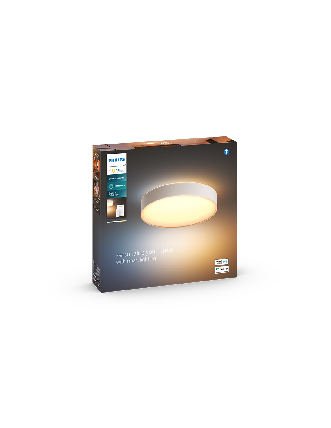 La lámpara Enrave mediana de techo es lo que estás buscando si quieres una iluminación regulable, potente y cómoda para tu baño (IP44). Se mueve entre tonos de luz blanca cálida a fría con Hue White Ambiance (2.00K - 6.500K) para que personalices tus momentos en el cuarto de baño. Dispone de las siguientes dimensiones: altura de 8,4 cm, longitud de 38,1 cm y ancho de 38,1 cm.