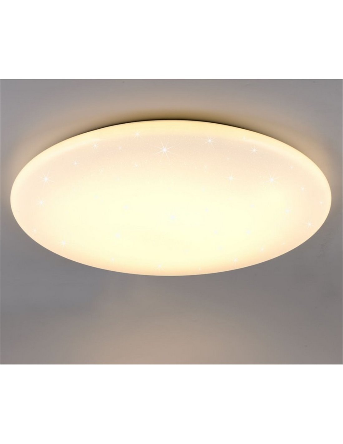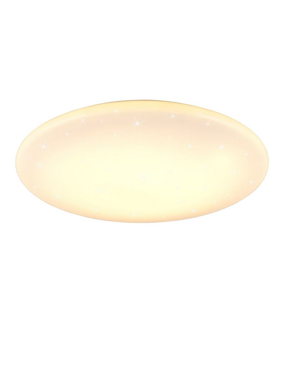 Su acabado en blanco con cubierta estrellada añade un toque decorativo único, combinando modernidad y funcionalidad. Este efecto hace que el plafón destaque incluso apagado, integrándose fácilmente en interiores contemporáneos.