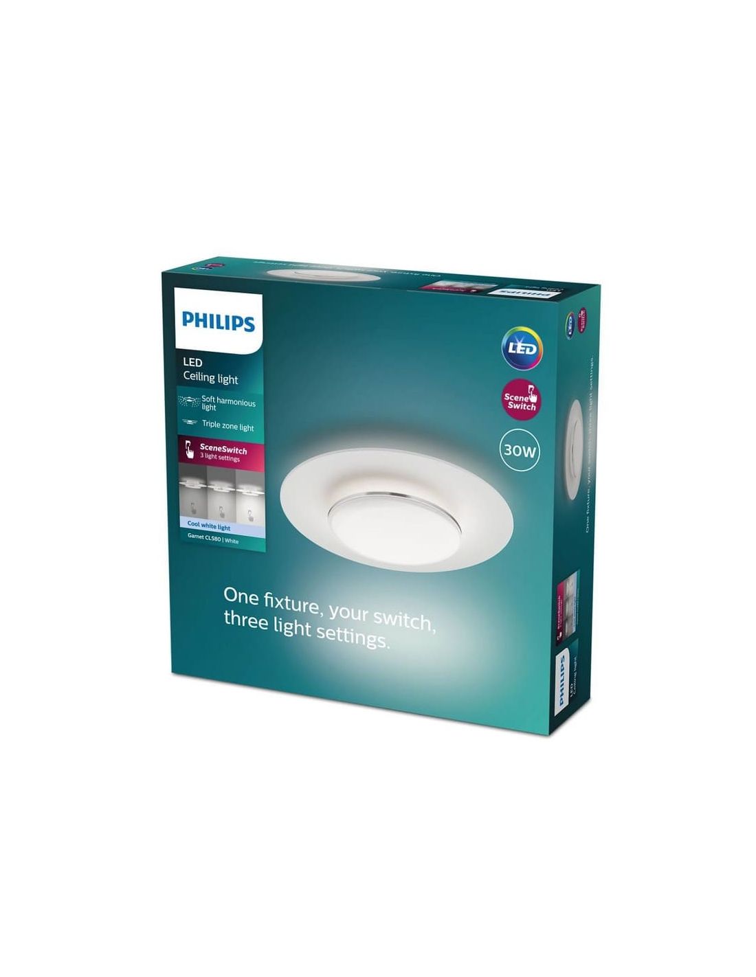 Experimenta el confort visual y la versatilidad de iluminación con el Plafón de Techo LED Redondo GARNET Ø40cm de Philips. Equipado con tecnología SceneSwitch, este plafón te permite seleccionar entre diferentes tonos de luz, incluyendo una opción de luz fría (4000K), para adaptarse a tus necesidades y preferencias en cada momento del día.