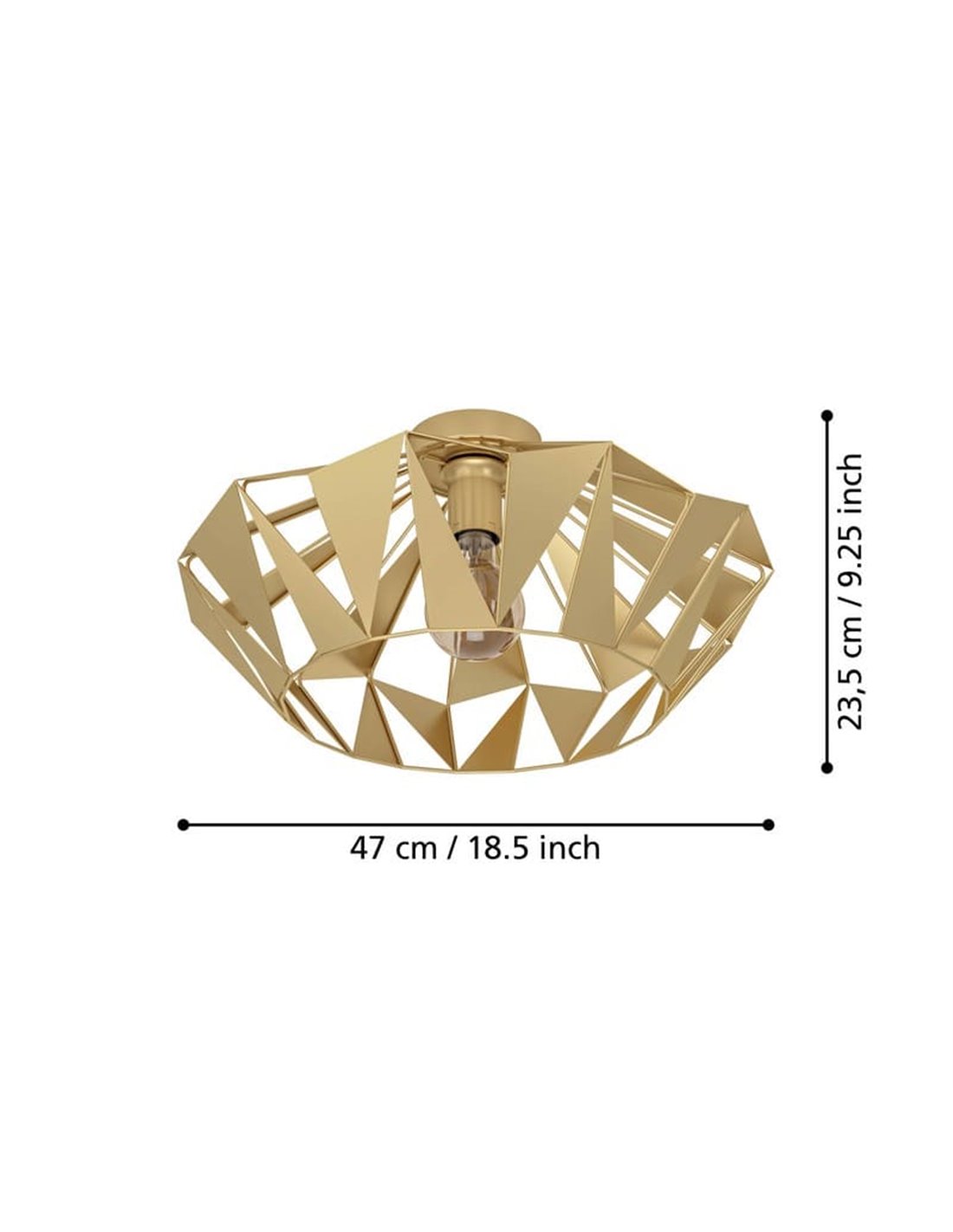 El plafón EGLO CARLTON destaca por su cuerpo metálico en forma de diamante y acabado dorado. Al encenderse, el diseño calado genera un patrón decorativo de luces y sombras que realza estancias con estilo retro chic.