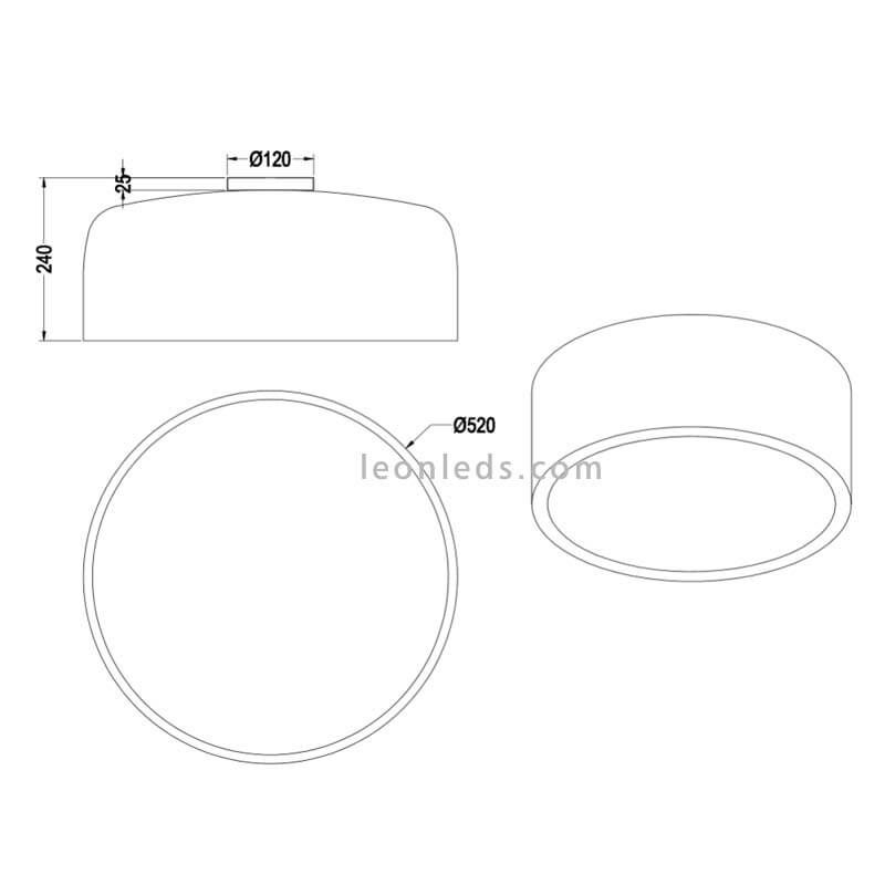 Plafón de techo Blanco moderno de la serie Baron de color Blanco con un difusor acrílico de color blanco mate, con una dimensiones de 52Cm de diámetro y una altura de 24Cm, para instalar en el interior 4 Bombillas LED. Las dimensiones también se pueden comprobar en una de las fotos.
