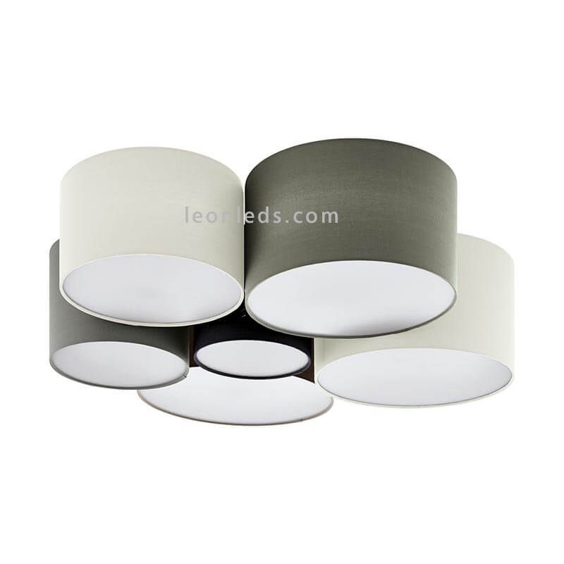 Plafón de techo textil multicolor grande Pastore 6xE27 de Eglo Iluminación. Está fabricada con una estructura formada por 6 pantallas textiles redondas unidas entre sí de color crudo, gris marrón y negro.
