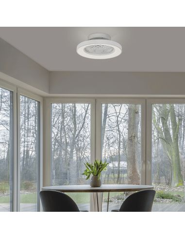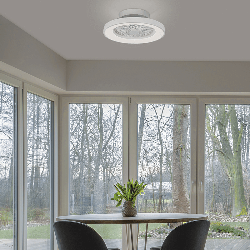 Este ventilador silencioso y plafón LED cuenta con un diseño moderno y minimalista constituido por 7 aspas fabricadas en ABS y con una estructura de color blanco. Cuenta con LED incorporado que proporciona una potencia de 70W, una intensidad de luz de 4.900Lm equivalente a más de 300W de una bombilla antigua.