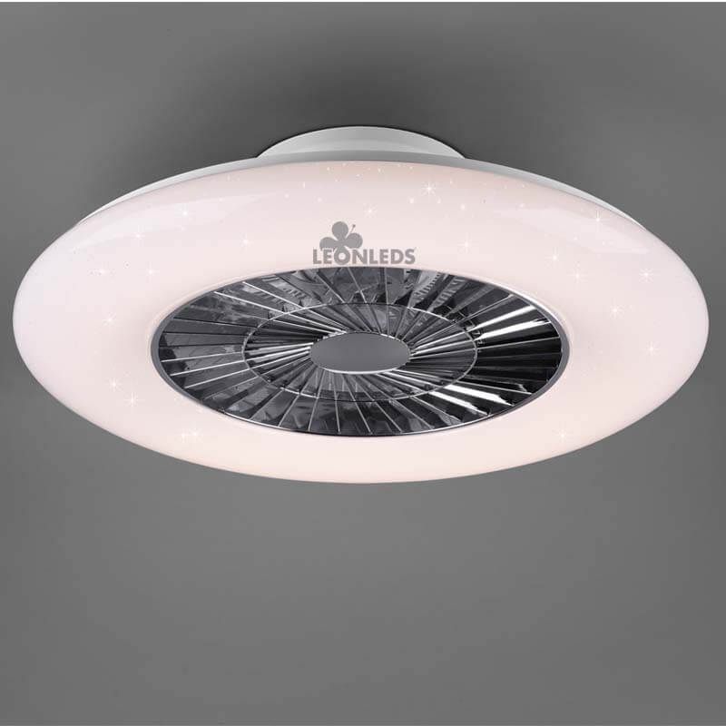 El Plafón ventilador LED con mando de color cromado de la serie Visby de Trio Lighting, un ventilador silencioso que se puede controlar con su mando a distancia, (Incluido) y permite regular tanto la intensidad de luz como la tonalidad de luz. Cuenta con motor AC y con 7 aspas fabricadas en ABS, su estructura metálica de color cromado que esconde las palas y por la parte exterior encontramos el difusor de luz que ofrece un efecto de brillo similar a las estrellas. El Ventilador ofrece 3 velocidades de regulación y en minima potencia genera tan solo 45 decibelios con un consumo de tan solo 40W.