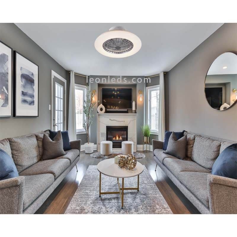 Este Plafón Ventilador LED con mando es ideal para instalar en estancias de grandes dimensiones y es perfecto para instalar en estancias de entre 13m2 y 28m2, es un ventilador de talla L y su instalación solo se puede instalar en interior ya que cuenta con un IP20. No se puede instalarlo en techo inclinado y cuenta con función inversa, lo podemos utilizar durante todo el año. Este Plafón Ventilador tiene un peso total de 4Kg, gracias a su peso ligero es ideal para instalar en techo donde no se puede instalar Ventiladores pesados como puede ser la escayola o el pladur.