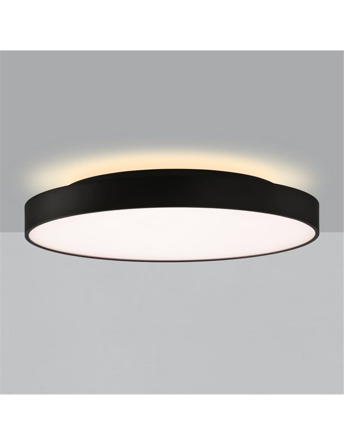 El plafón/aplique LED ROMA 60 negro combina iluminación general e indirecta en un diseño moderno de gran formato. Ofrece 2800 lúmenes de luz principal más una luz superior de 5W y 500 lúmenes para crear un ambiente decorativo.
