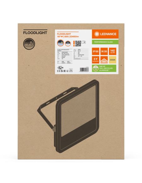 Proyector LED Blanco 167W/150W con 25,000Lm. Alta eficiencia con selector de potencia, protección IP66 y vida útil de hasta 100,000 horas. Disponible en 3000K, 4000K y 6500K. Cuenta con selector de potencia de 23.400Lm y 21.060Lm en 3000k y 25.000Lm y 22.250Lm y 4000K y en 6500K, 5 años de garantía gama Performance de LedVance, óptica simétrica. Protección contra sobre-tesiones de 6Kv.