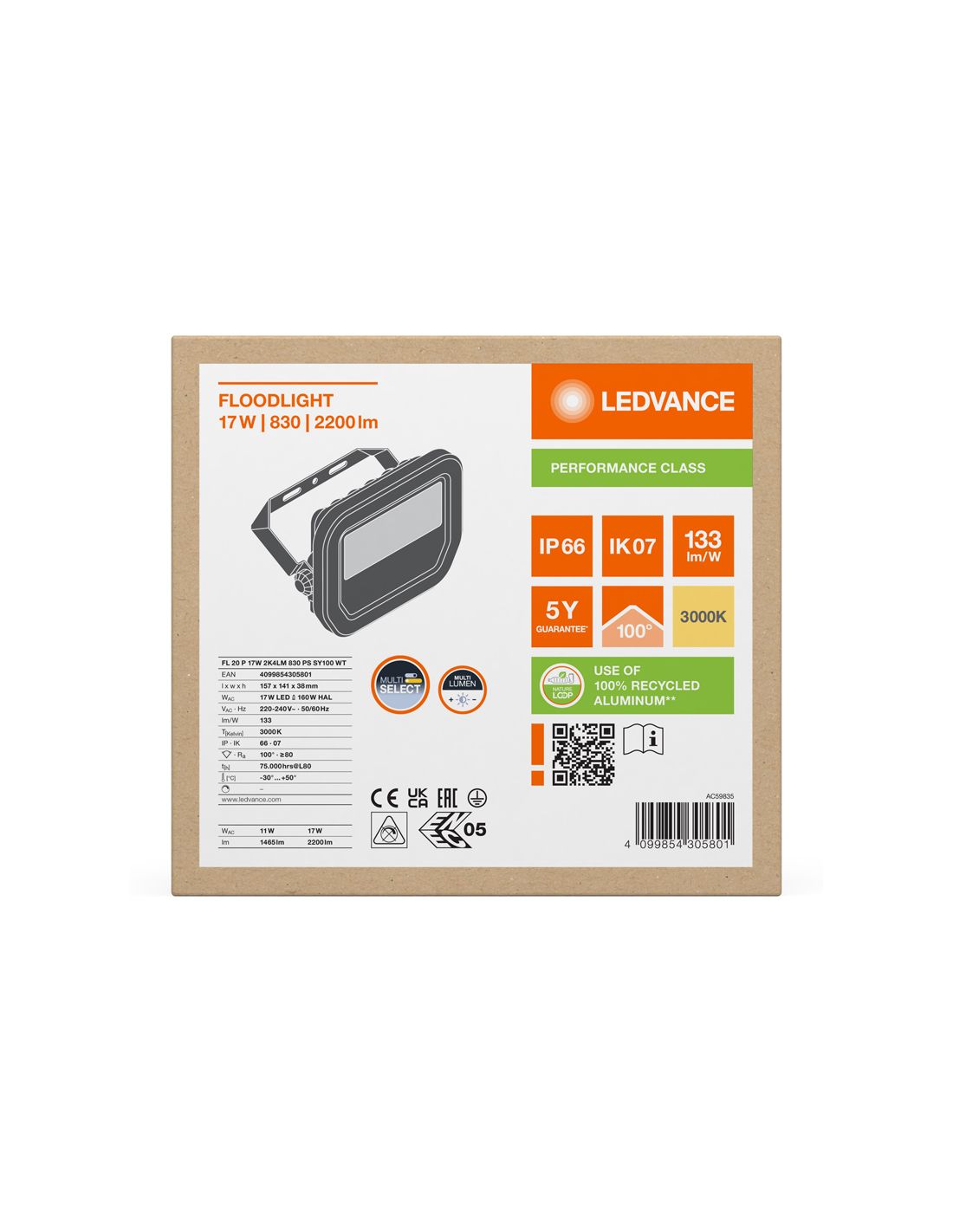 Proyector LED de 17W para exteriores blanco, con IP66, cristal esmerilado, función Multi Lumen y alta eficiencia. Ideal para fachadas, parkings y áreas públicas, tanto en exterior como en interior (IP66), su resistencia a impactos es de IK07. Cuenta con selector de potencia de 2.400Lm y 1600Lm, 5 años de garantía gama Performance de LedVance, óptica simétrica. Protección contra sobre-tesiones de 4Kv.