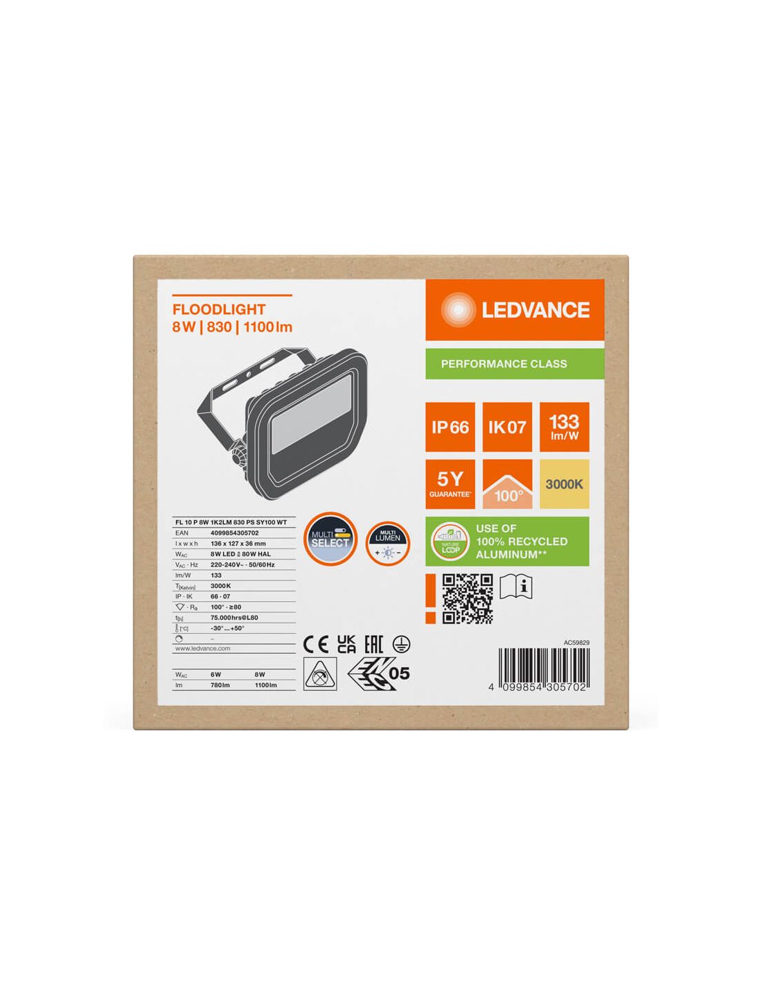 Proyector LED para exterior blanco FL 10 P 8W con tecnología Multi Lumen Gen 4, cristal templado, y membrana de disipación. Ahorro del 90% y hasta 100.000 horas de vida útil. perfecto para instalar tanto en exterior como en interior (IP66), su resistencia a impactos es de IK07. Cuenta con selector de potencia de 1.200Lm y 800Lm, 5 años de garantía gama Performance de LedVance, óptica simétrica. Protección contra sobre-tesiones de 4Kv.