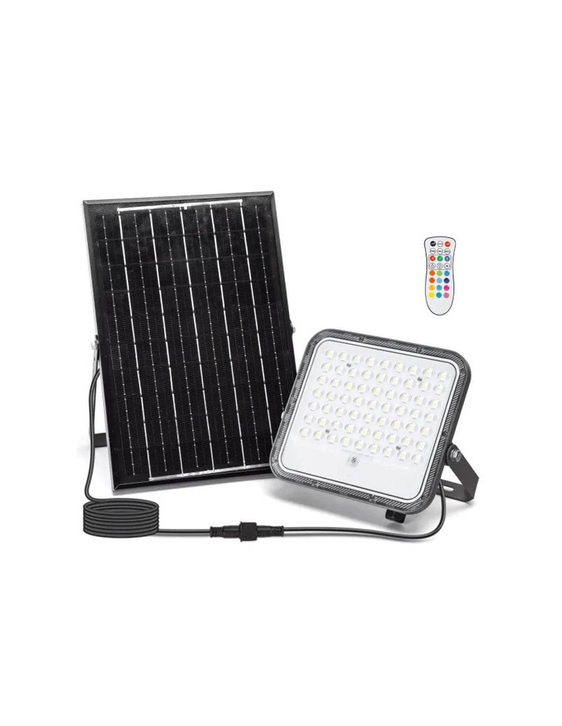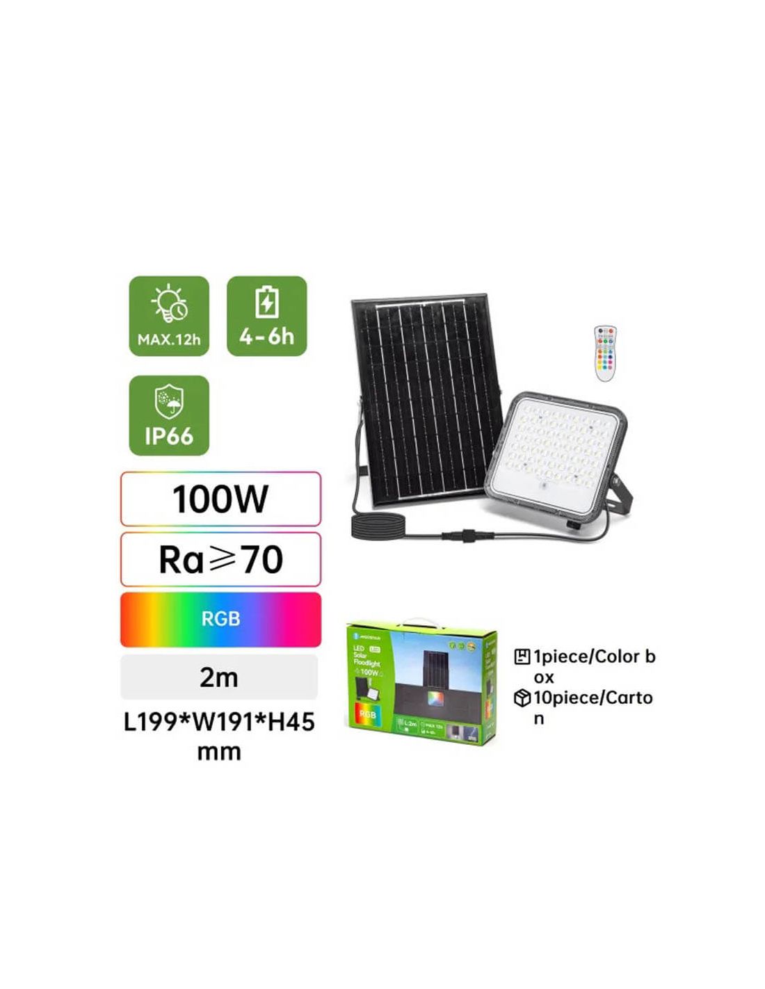 Proyector solar LED RGB 100W con 16 colores estáticos y 3 modos dinámicos. Incluye panel solar monocristalino de 10W, batería 8000mAh, 2 metros de cable y protección IP66 para exterior. Ideal para iluminación decorativa sin cables.