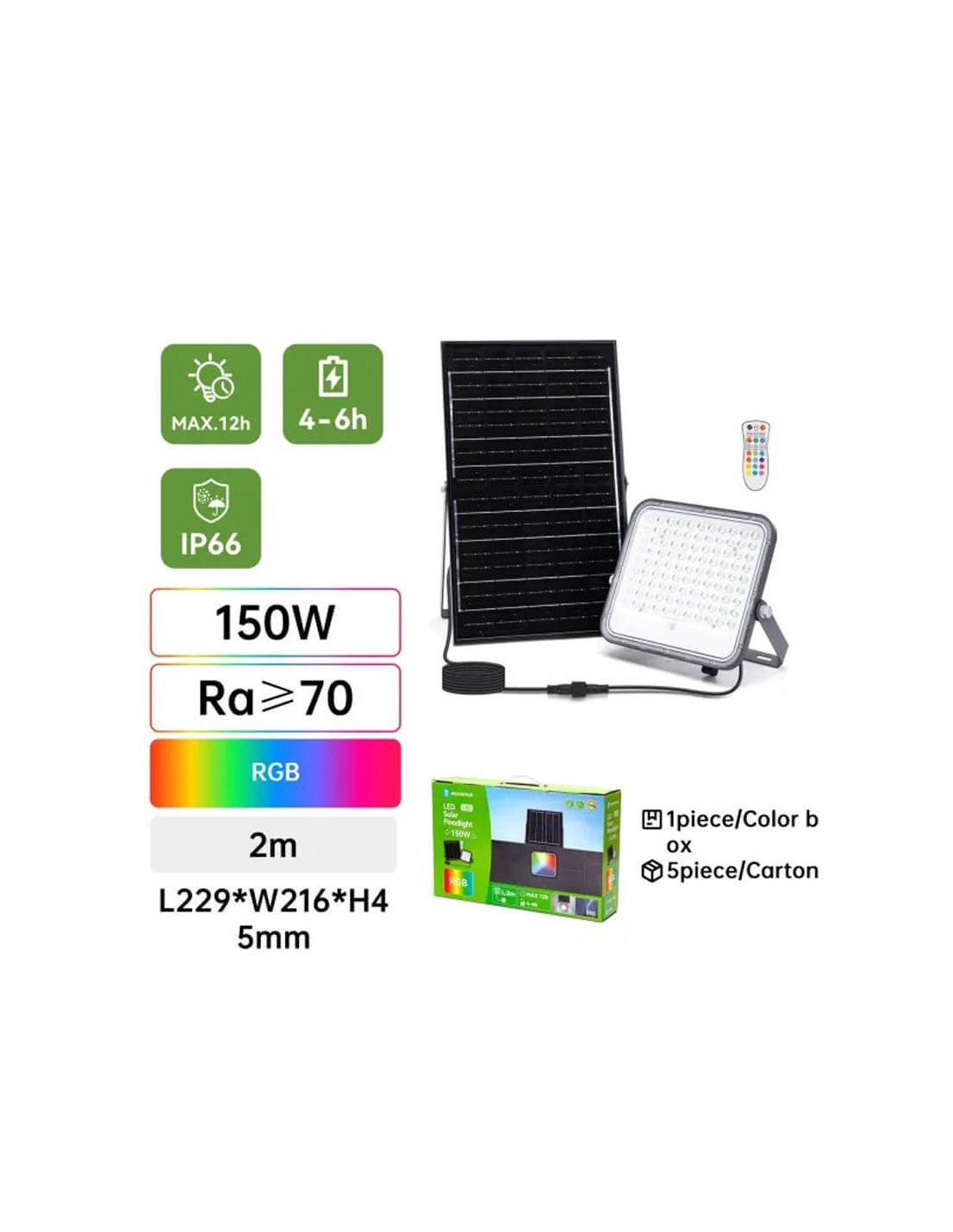 Proyector Solar LED RGB 100W con Panel 2m – IP66 Exterior con Mando