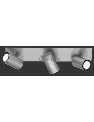 Regleta plafón rectangular con 3 focos orientables de color níquel de la colección Marley de Trio Lighting. Es una luminaria de techo interior que cuenta con una estructura y 3 focos metálicos orientables que pueden girar sobre su eje 330º y nos permiten dirigir la luz hacia las zonas deseadas de forma individual.