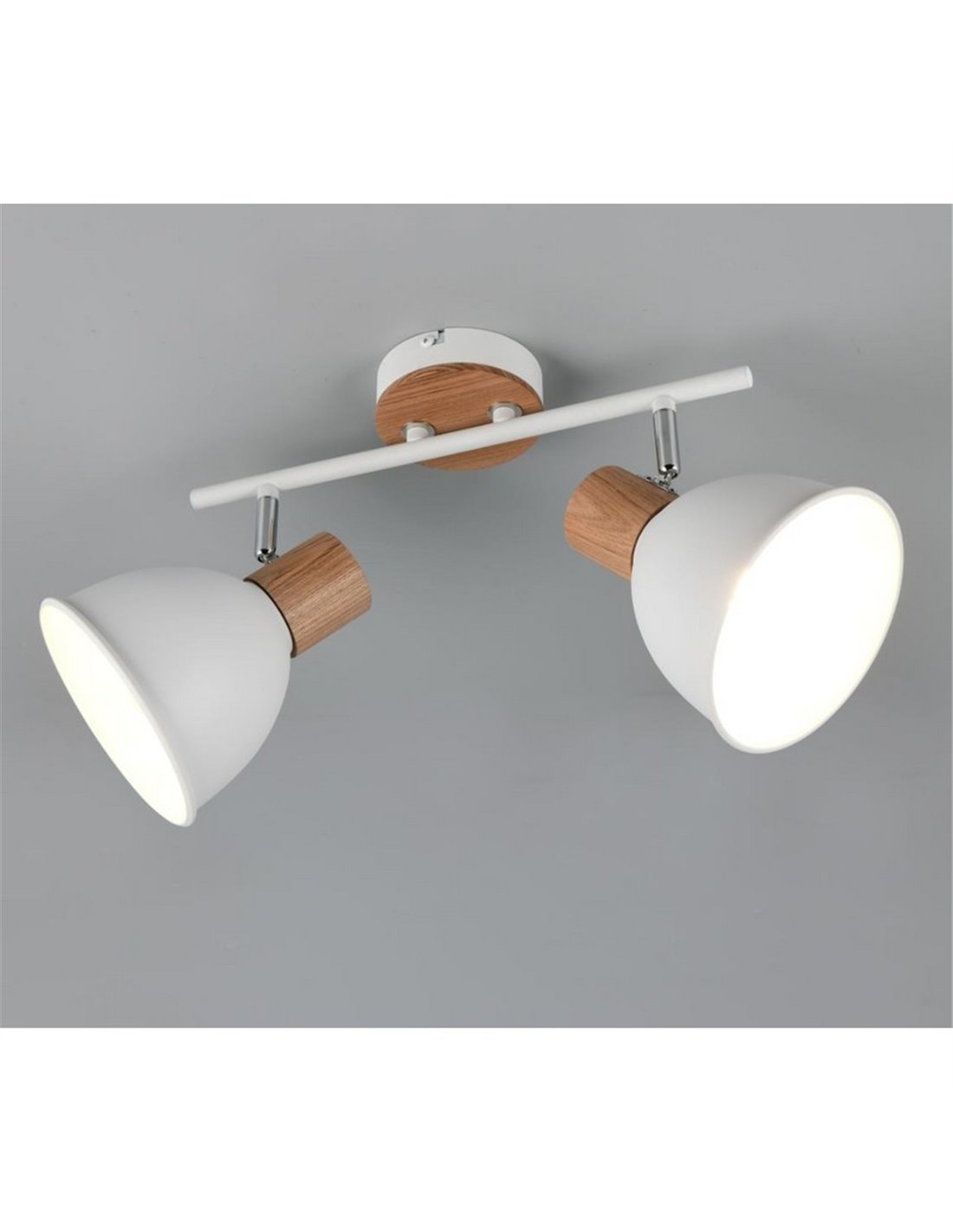 La regleta de 2 focos DELUME blanco efecto madera combina diseño moderno y toques naturales en una pieza funcional y decorativa. Fabricada en metal blanco mate con detalles en efecto madera, ofrece una luz orientable perfecta para salones, pasillos o dormitorios. Utiliza 2 bombillas E27 de hasta 40W (no incluidas) y cuenta con protección IP20.