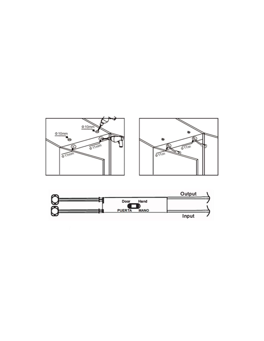 El sensor está diseñado para instalación empotrada, con dos perforaciones de Ø11 mm. Incorpora cableado de 1 metro para entrada, salida y sensores.