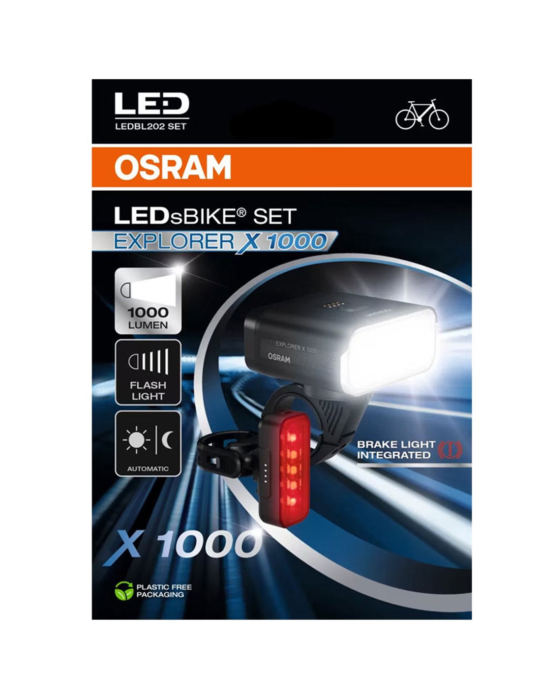 El LEDsBIKE® EXPLORER X 1000 SET es un set de luces para bicicleta de alto rendimiento con 1000 lúmenes, pensado para quienes priorizan visibilidad y control. Su luz delantera incorpora modo automático con sensor de brillo (además de 100/50/25% y flash) y la trasera suma un plus de seguridad con modo automático y función de luz de freno.