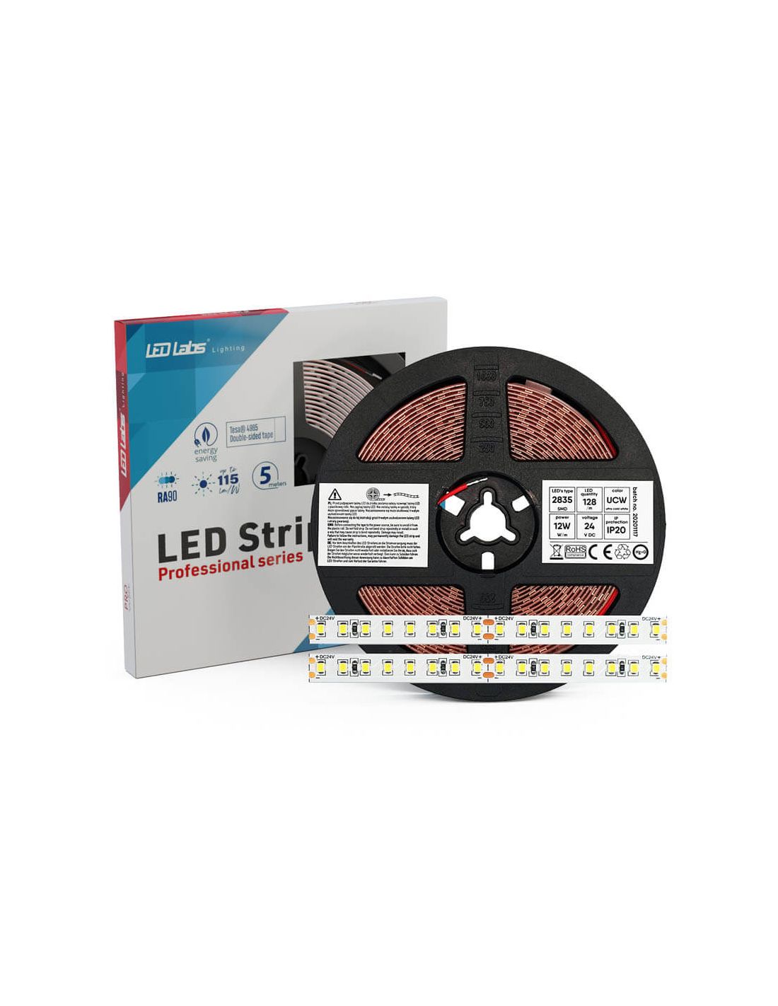 Rollo tira LED 5 metros de tira de LED para voltaje de 24V, una potencia por metro de 12W, una intensidad de 1.440Lm por metro, 128 leds por metro, un grado de hermeticidad de IP20 (uso interior), un ángulo de haz de 120º, una anchura para perfil de aluminio de 10mm y una longitud de 5 metros.