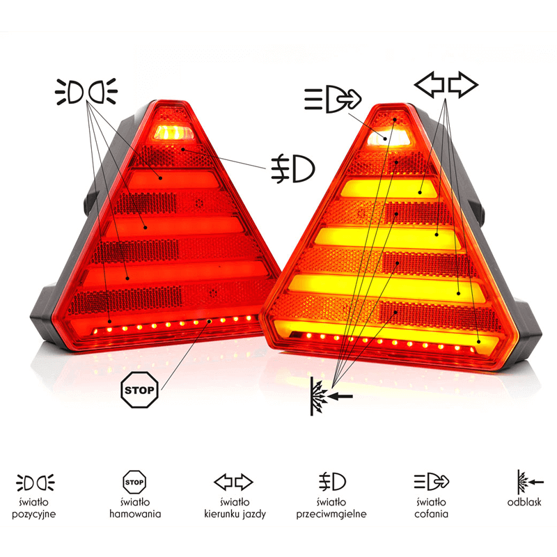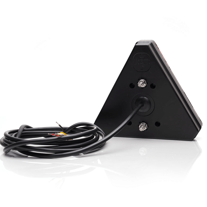Piloto LED trasero con triangulo valido para instalaciones de 12 voltios y de 24 voltios con 3 Funciones, incluye 200Cm de cable, se puede instalar sin los soportes que ofrecería una anchura de tan solo 4,05Cm.