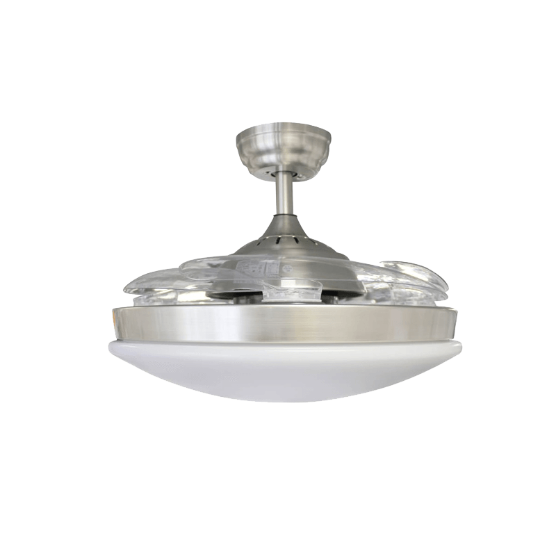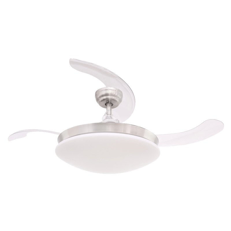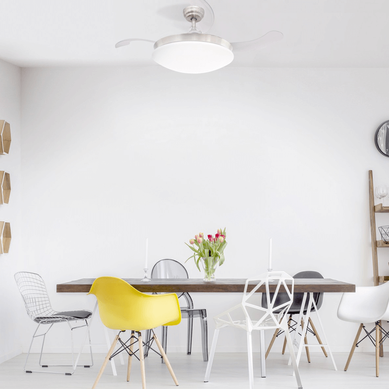 Las palas de este ventilador son transparentes y retráctiles lo que permite ocultarlas para ganar en elegancia mientras el ventilador no esté en funcionamiento. Asimismo, permite la instalación en techos inclinados, con una inclinación máxima de 15º lo que se adapta prácticamente a cualquier vivienda.
