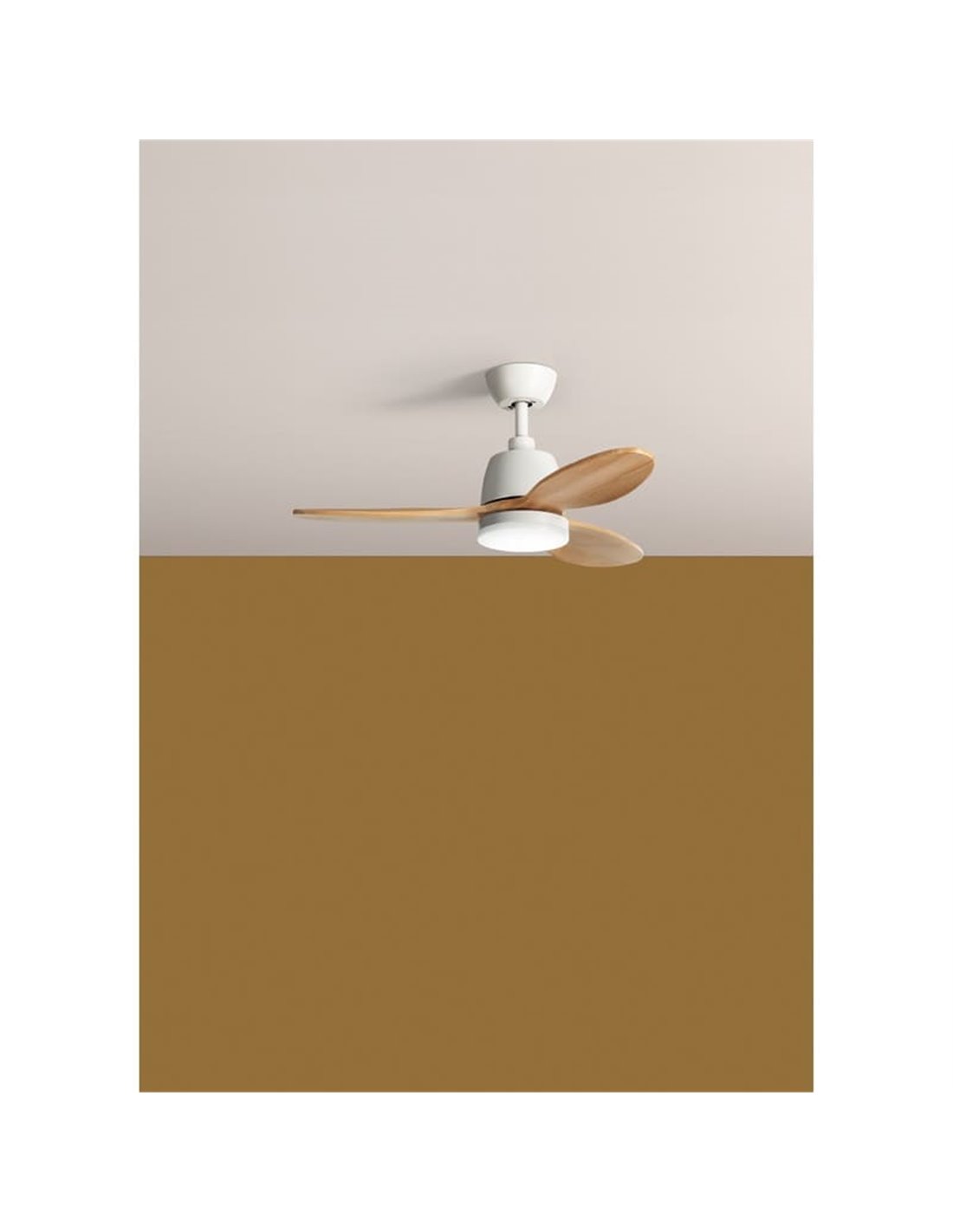 Ventilador de Techo con Luz LED 24W CCT SYDNEY XS blanco y madera natural Ø96, con motor DC de 18W y luz LED de 24W. Incluye ajuste de temperatura de color (CCT) y es ideal para una ventilación eficiente y una iluminación adaptable en cualquier espacio interior.