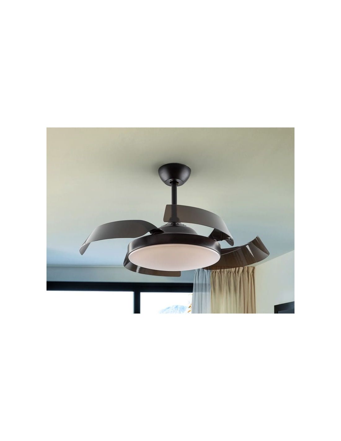 Las 4 aspas retráctiles de acrílico negro brillo, semiopaco, junto con el difusor acrílico opal, crean un efecto visual cautivador y una distribución uniforme de la luz en la habitación. El motor DC de 35W y 6 velocidades e inversión garantiza un funcionamiento silencioso y eficiente, adaptándose a tus necesidades de ventilación y proporcionando un ambiente cómodo en todo momento.