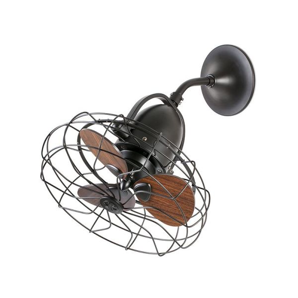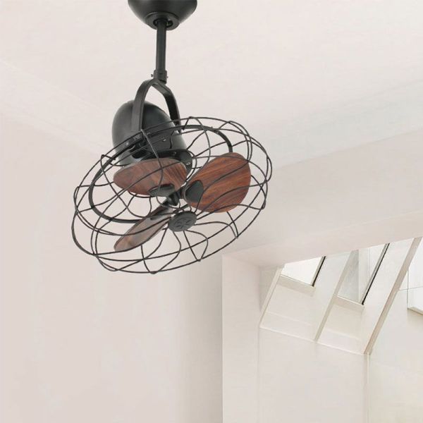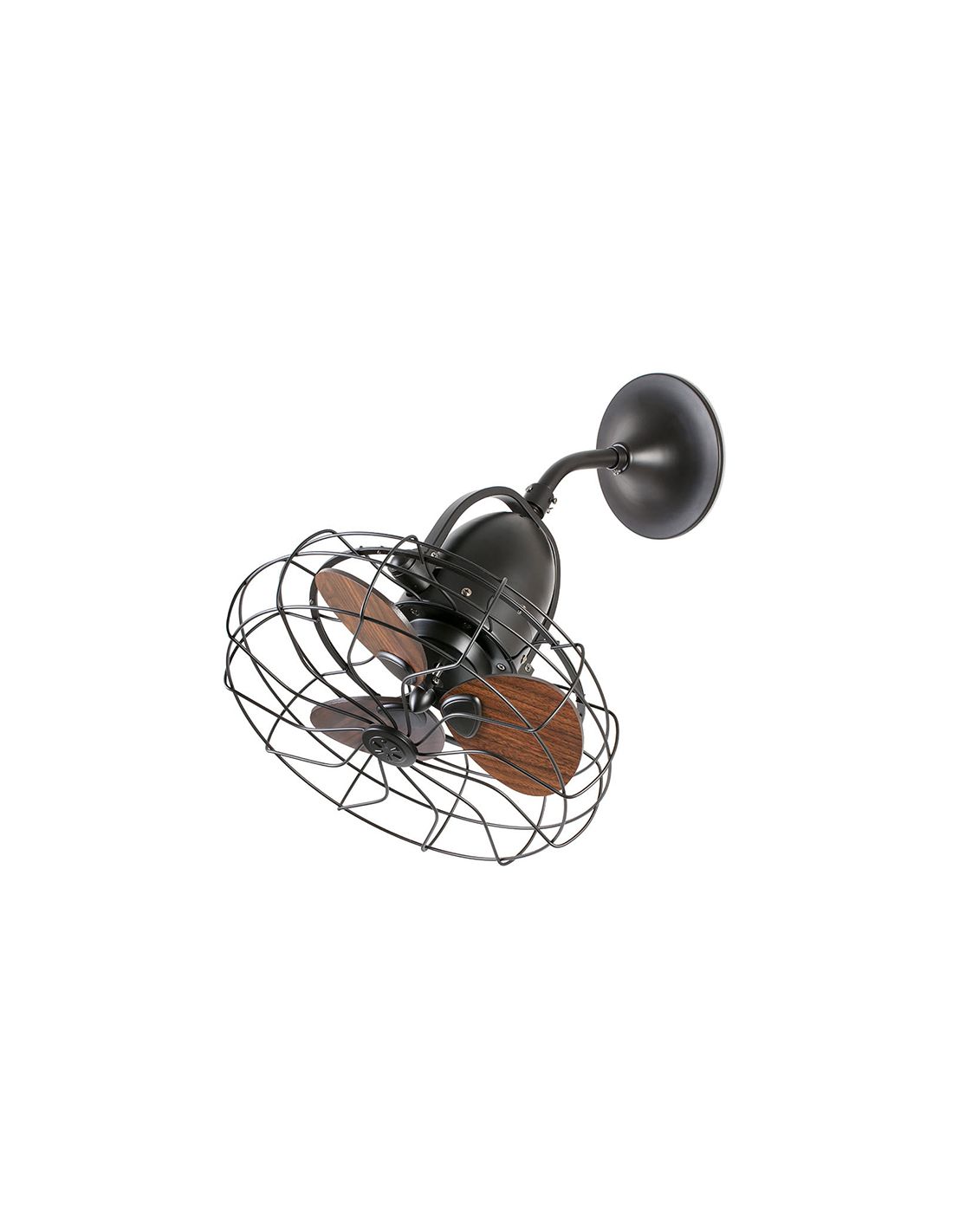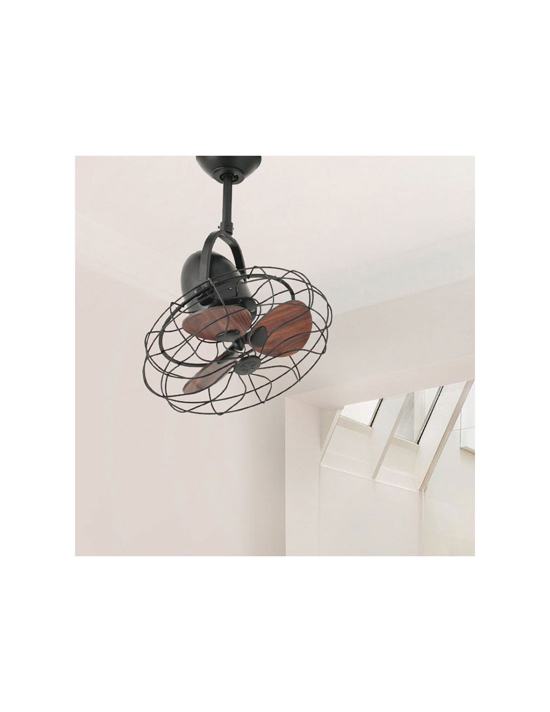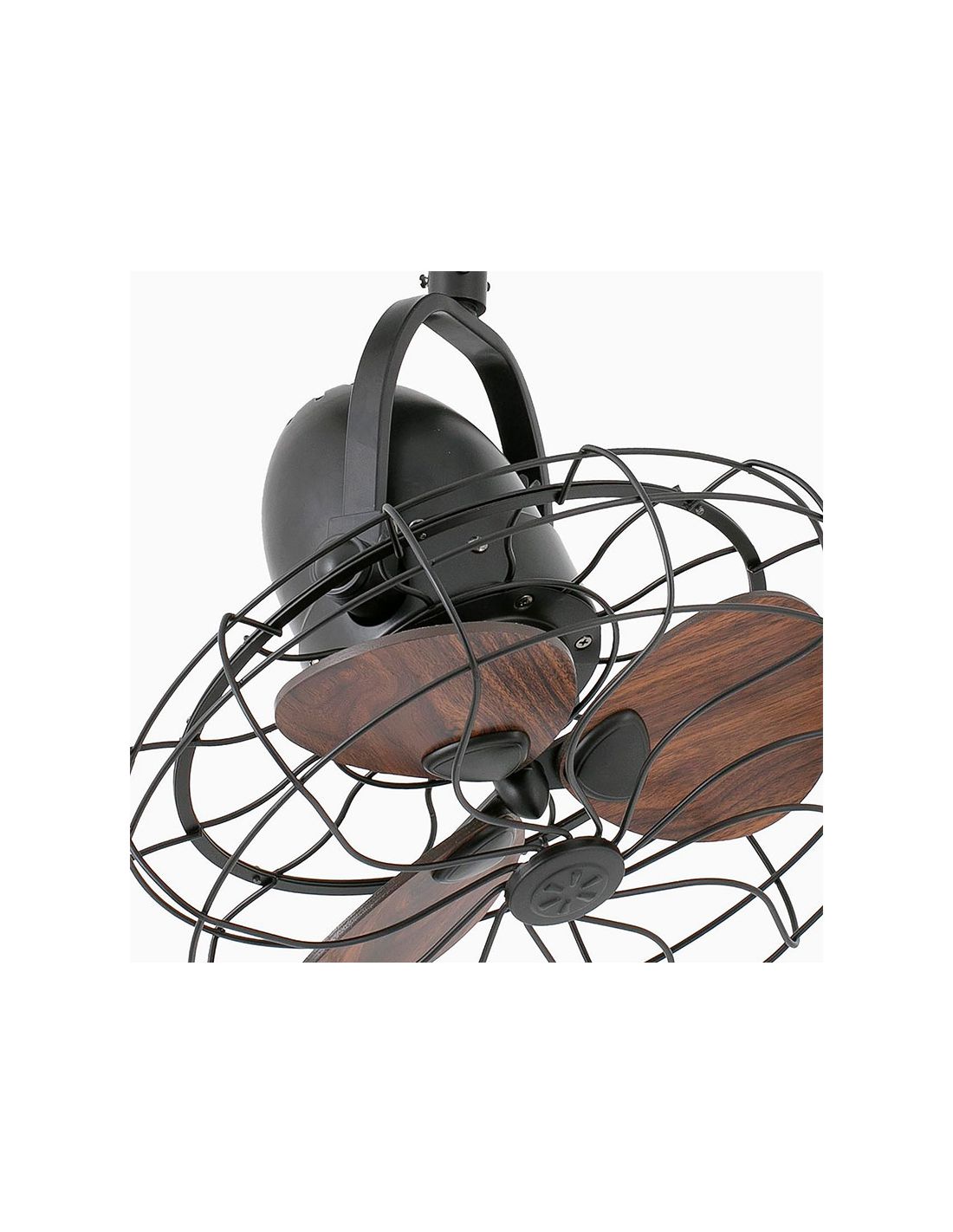 Ventilador de Techo KEIKI S de estilo industrial y retro, en color negro y aspas marrón. Se puede poner en el techo y en la pared, dirigiendo el aire hacia el lado que quieras. Tiene función inversa, lo que permite utilizar este ventilador en verano o en invierno.