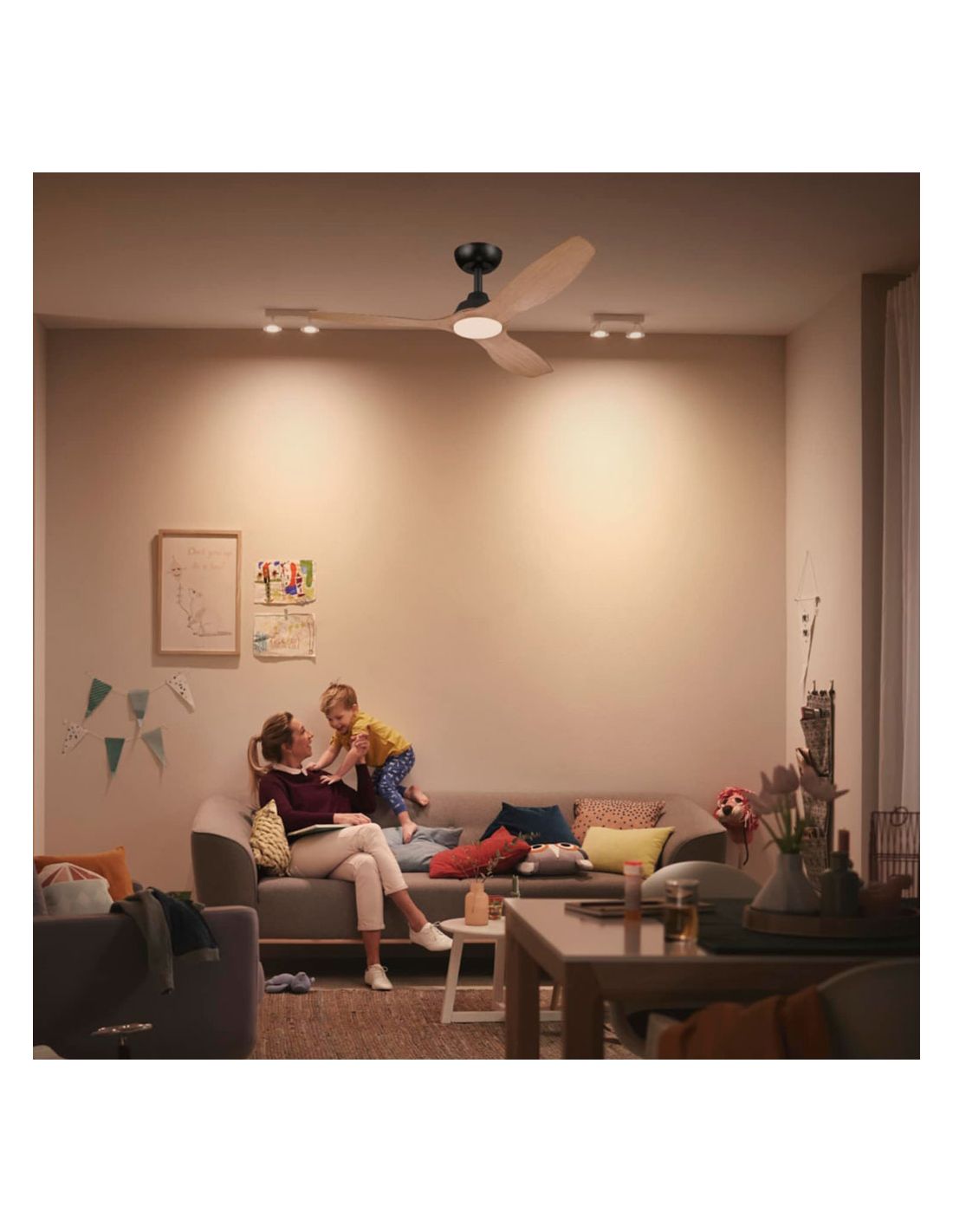 El ventilador de techo OLAS en acabado negro con madera y diámetro de 132 cm ofrece ventilación potente e iluminación eficiente. Incorpora LED de 24W con 2650 lúmenes y temperatura de color regulable.