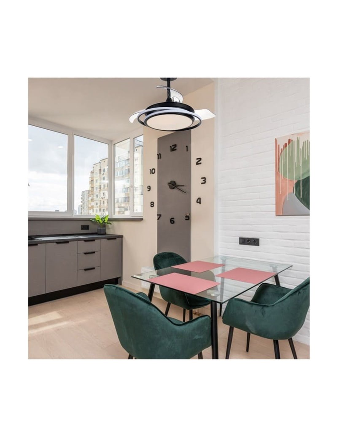 Este ventilador dispone de aspas retráctiles de ABS que se esconden cuando no está en funcionamiento, y permite encender la luz principal, el aro decorativo o ambos a la vez. Es una solución práctica y estética que se adapta a cualquier estilo de interiorismo moderno.