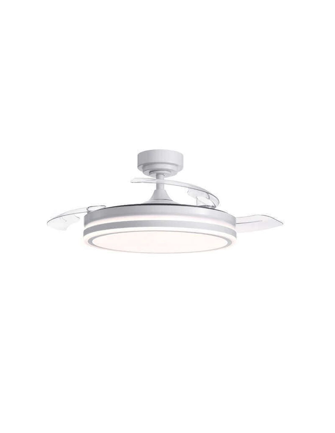 Ventilador de techo LED Moss con aspas retráctiles. Ventilador moderno de color blanco con un práctico diseño que permite tanto aportar ventilación como iluminar la estancia. Lleva integrada iluminación LED dimmable en intensidad de lúmenes y tres temperaturas de color (3000-4000-6000K). Además, con el mando a distancia puedes seleccionar función brisa, un modo luz de noche o fijar el apagado del ventilador a las 2-4 horas. Motor DC ultrasilencioso con seis velocidades de giro y función inversa invierno verano. Ventilador de color blanco y aspas transparentes.