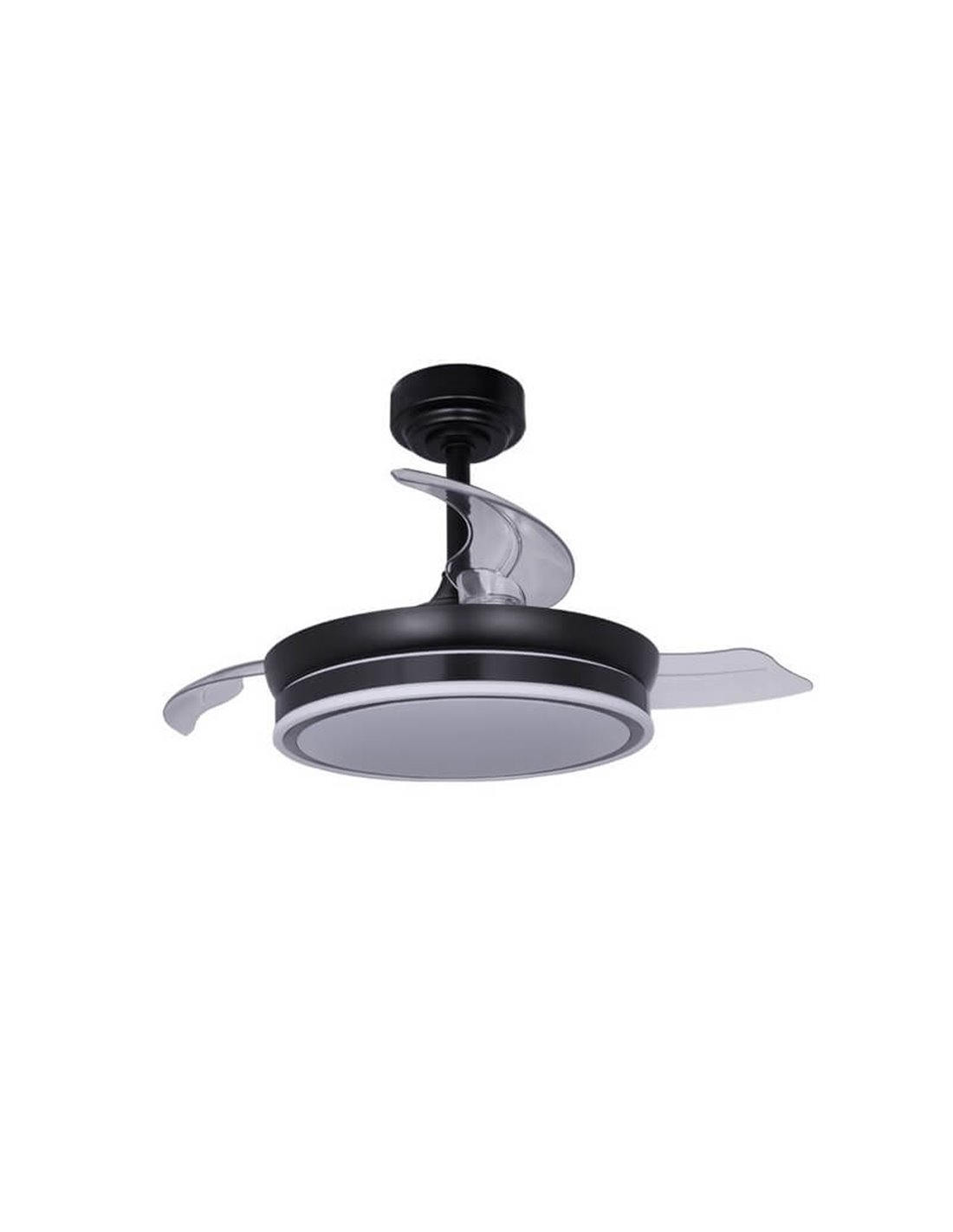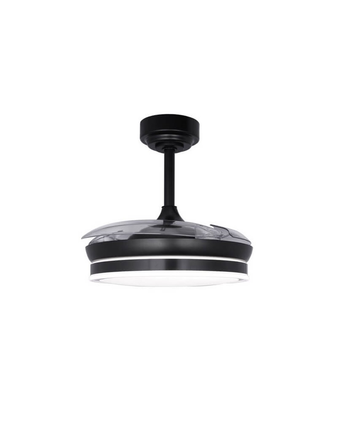 Ventilador de techo LED Mini Moss para estancias pequeñas. Ventilador de techo con aspas retráctiles diseñado para aportar flujo de aire e iluminación en dormitorios y salones pequeños. Cuenta con un motor ultrasilencioso de 6 velocidades de giro, función inversa invierno-verano, temporizador y función brisa. En cuanto a la iluminación, puedes establecer tres tonos de iluminación (cálida, neutra o fría) y dimar la intensidad de lúmenes. El cuerpo del ventilador es de color negro y las aspas plegables son transparentes.