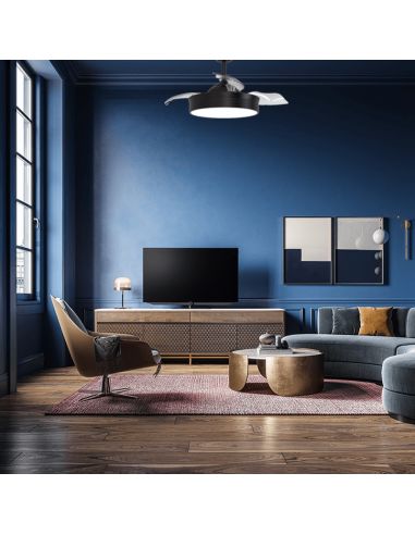 Cuenta con tres palas retráctiles y fuente de luz LED con iluminación regulable. El modelo Bombay S de 2400 lúmenes ofrece una potencia máxima de 24W y el modelo Bombay L con 3300 lúmenes una potencia de 36W. En ambos es posible ajustar la luz para la creación de ambientes cálidos, neutros o fríos personalizados para cada ocasión.