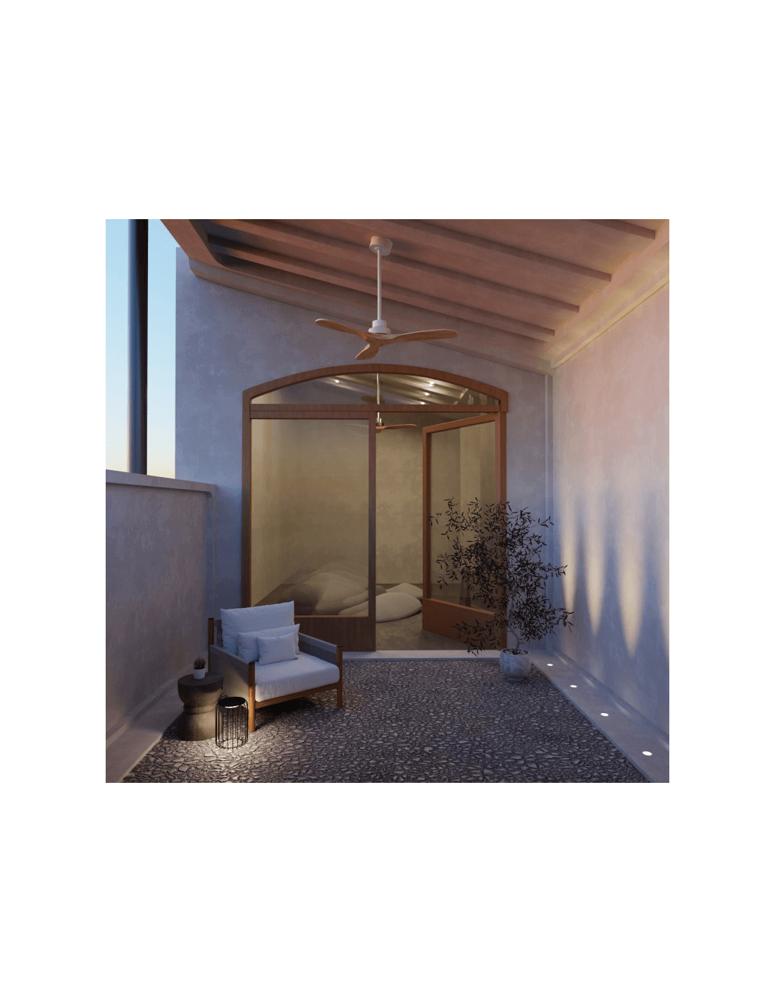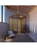 Sus 3 palas son de madera natural, obtenidas de bosques con talas controladas y de manera sostenible. Está disponible en dos tamaños y dos acabados. Cuenta con protección IP44 y su instalación permite una inclinación de techo máxima de 15º.