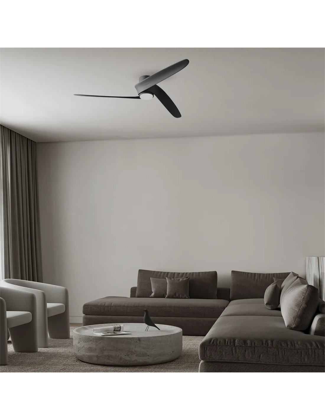 El ventilador de techo GROENLAND M negro ofrece una combinación equilibrada entre diseño decorativo y rendimiento. Su acabado negro aporta un estilo sofisticado, mientras que sus 3 aspas curvadas favorecen una ventilación amplia y uniforme en espacios de 13 a 20 m².