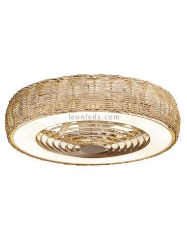 El ventilador Kilimanjaro de ratán cuenta con una potencia de luz de 70W y 3000lm que se puede regular tanto en intensidad como en tono de luz desde 2700k hasta 5000k con el mando a distancia que incluye. También incorpora temporizador y función de memoria.