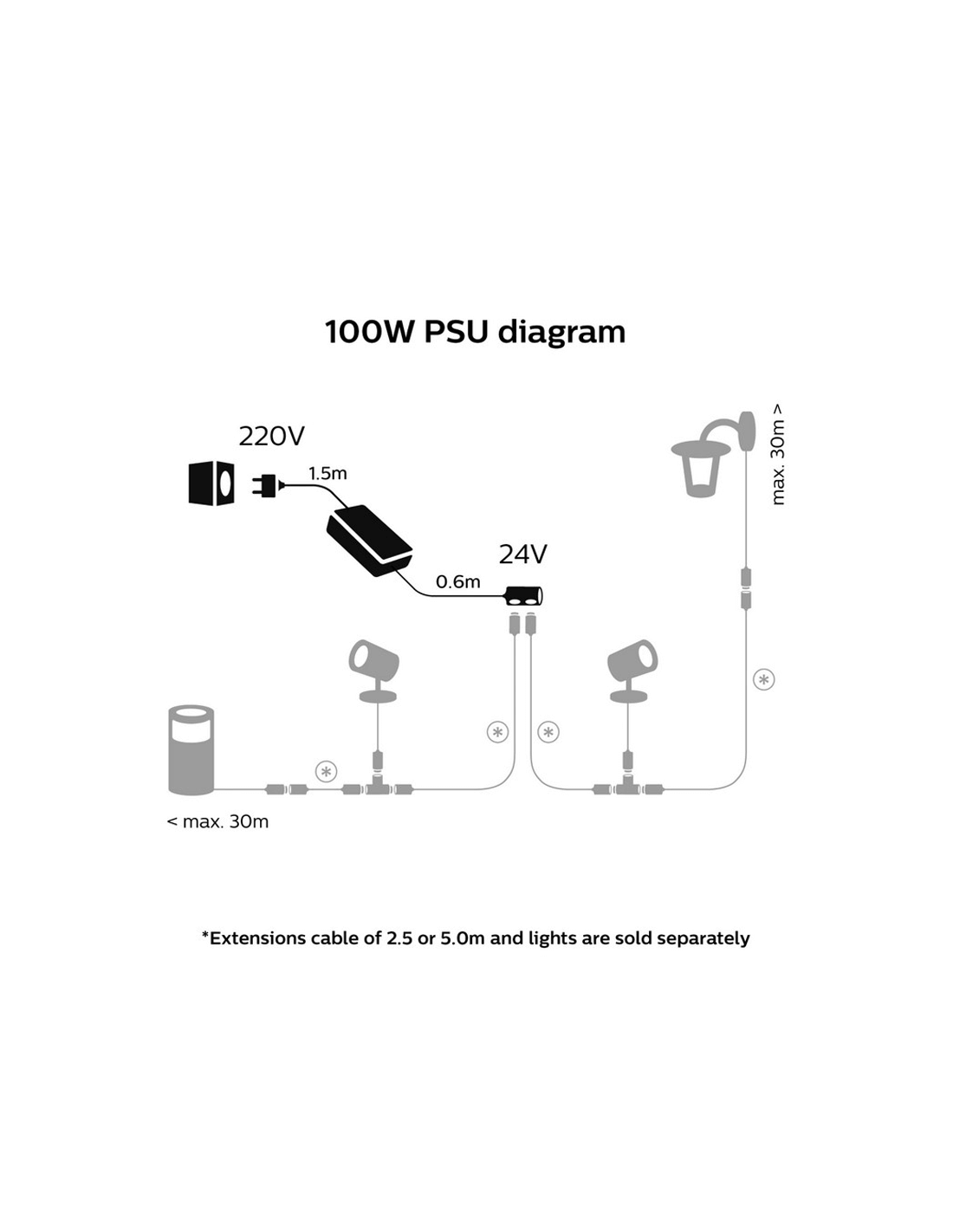 L'alimentation de 100 W vous permet d'ajouter jusqu'à un total de 100 W de différents types de lumières et de connecter jusqu'à 35 mètres de câble à n'importe quelle lampe extérieure basse tension Philips Hue.