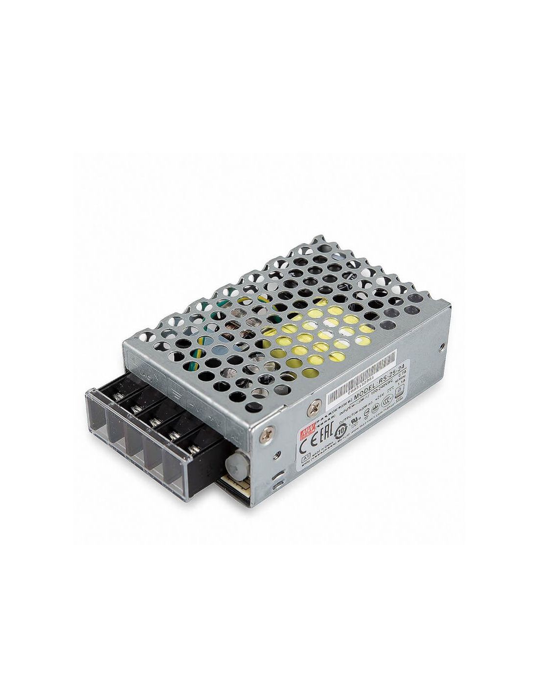 Alimentation Mean Well RS-25-24 pour installation intérieure, un modèle avec une puissance supportée de 26,4W valable pour les installations 24Vdc avec un courant nominal de 1,1A. La plage d'entrée est de 85-264 Vca 47-63 Hz.