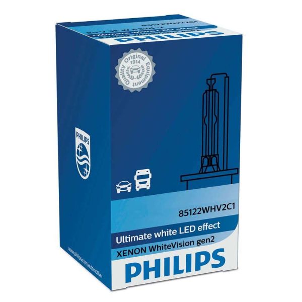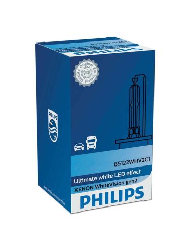 Boite de 1 Ampoule Xénon D1S (PK32d-2) de la marque Philips, modèle WhiteVision GEN2, c'est une Ampoule Xénon qui offre une lumière totalement Blanche avec un effet LED et une augmentation de la vision de plus de 120%.