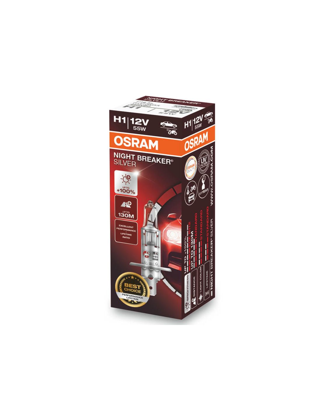Les ampoules Osran Night Breaker Silver sont la version 2.0 , la dernière version de cette série qui garantit 100% d'éclairage en plus par rapport à une ampoule halogène classique. Elle offre jusqu'à 130 mètres de portée lumineuse en plus et jusqu'à 2 fois plus de durée de vie par rapport à l'ampoule classique, elle peut atteindre jusqu'à 4 00/650 heures de durée de vie utile.