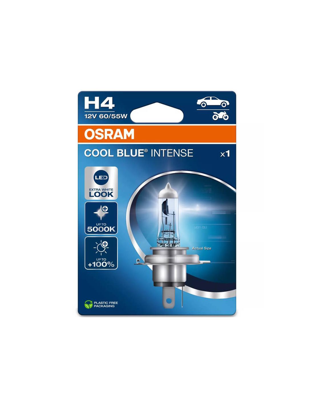 Ampoule OSRAM COOL BLUE INTENSE H4 nouvelle génération avec lumière blanche extra jusqu'à 5 000 K , soit 100 % de lumière en plus que la norme ECE minimale et homologuée E1 . Convient uniquement aux véhicules 12 V , avec feux de croisement et de route . Ampoule vendue à l'unité .