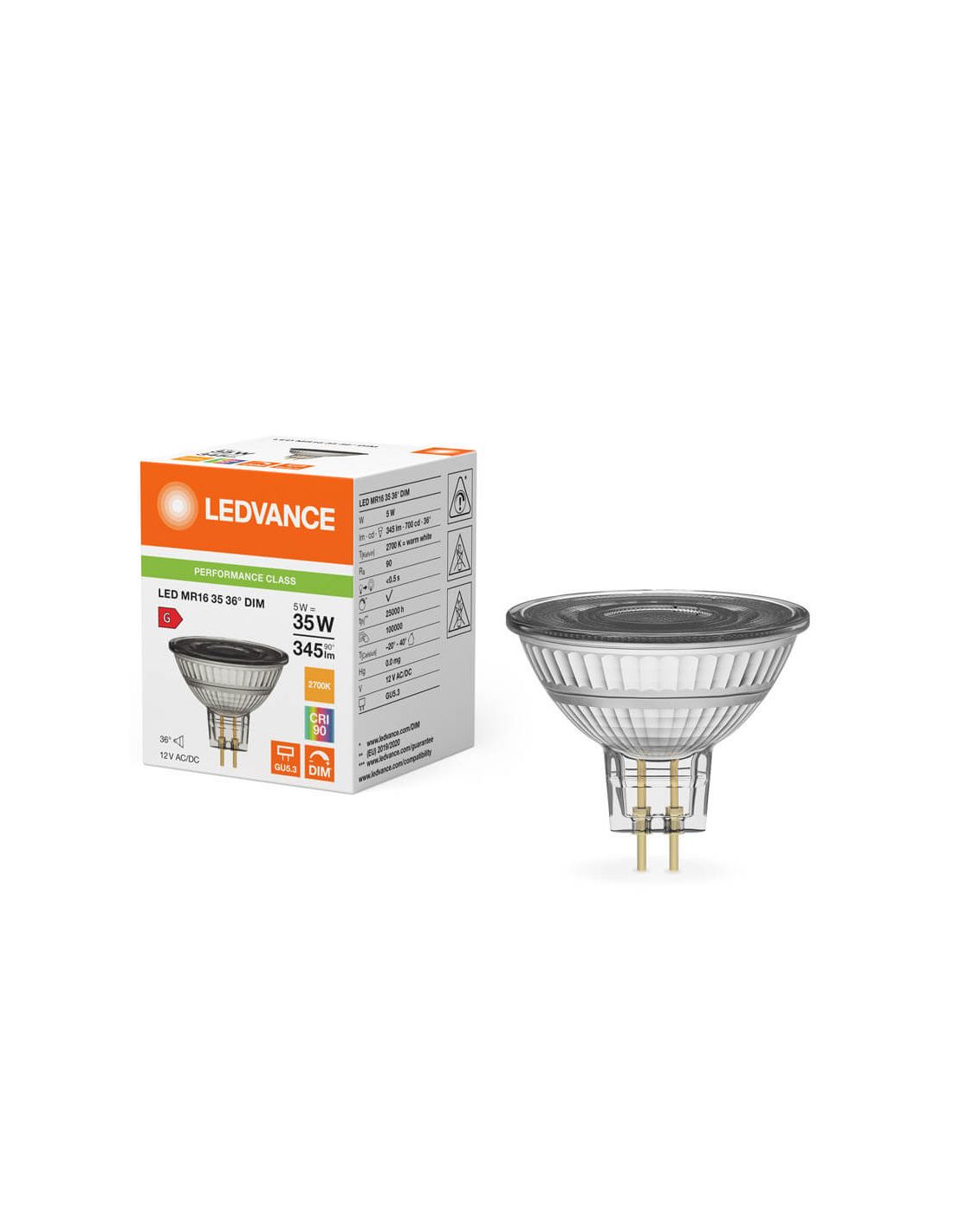 Ampoule LED MR16 d'une puissance de 5W équivalente à 35W d'une ancienne Ampoule Halogène, une intensité lumineuse réglable de 345Lm, un angle de faisceau lumineux de 36º, un CRI 90 et fonctionne à 12V. Ce modèle d'ampoule est issu de la gamme LedVance Performance et bénéficie d'une garantie de 5 ans et de 25 000 heures de durée de vie utile.