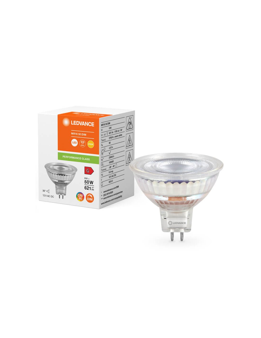 Ampoule LED MR16 12V d'une puissance de 8W équivalente à 50W des anciennes ampoules halogènes, une intensité lumineuse réglable de 621Lm et un angle de faisceau lumineux de 36º, CRI90. Gamme de performances avec 5 ans de garantie et 25 000 heures de durée de vie utile.