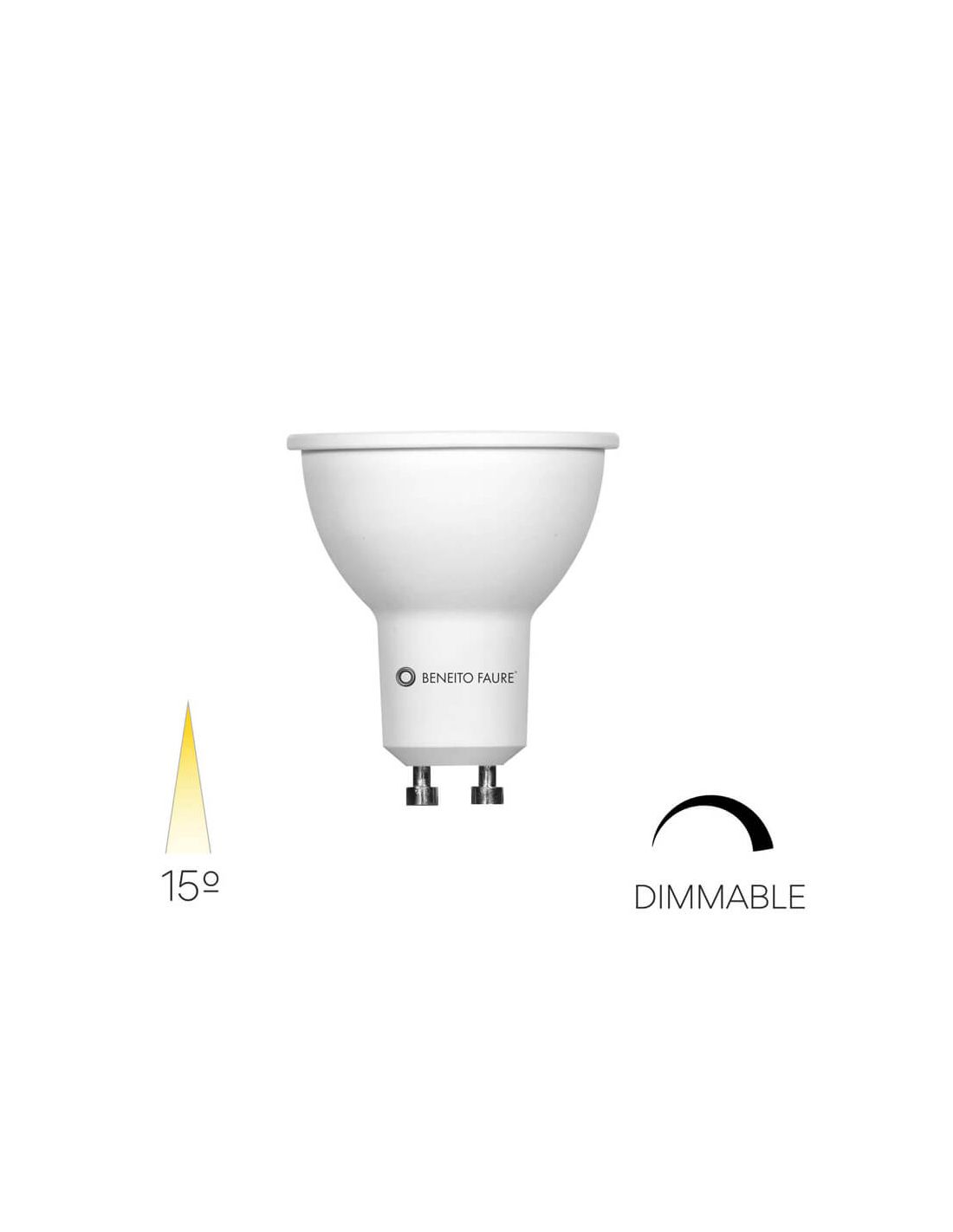 Ampoule LED GU10 étroite 7 W à intensité variable avec faisceau ultra-focalisé de 15° , disponible en 2700 K (400 lm) et 3000 K (420 lm). Gradable avec variateur TRIAC, IRC > 80, durée de vie de 25 000 h et garantie 3 ans. Idéale pour les applications nécessitant une lumière concentrée, comme l'éclairage de vitrines, de tableaux ou de niches.